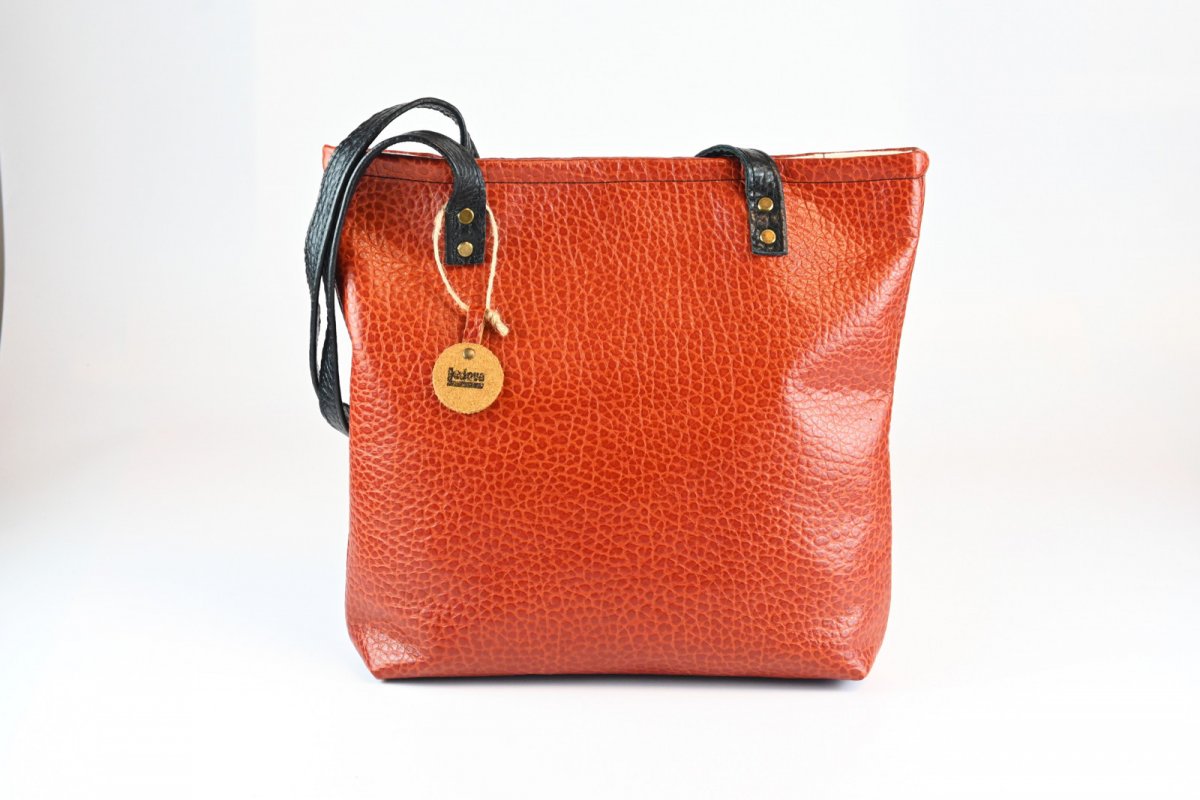 Velká kožená kabelka-taška z hovězí usně s ražbou v hnědo - cihlové barvě s černými popruhy