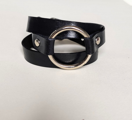 Náramek z pravé hovězí kůže s kováním stříbrné barvy.