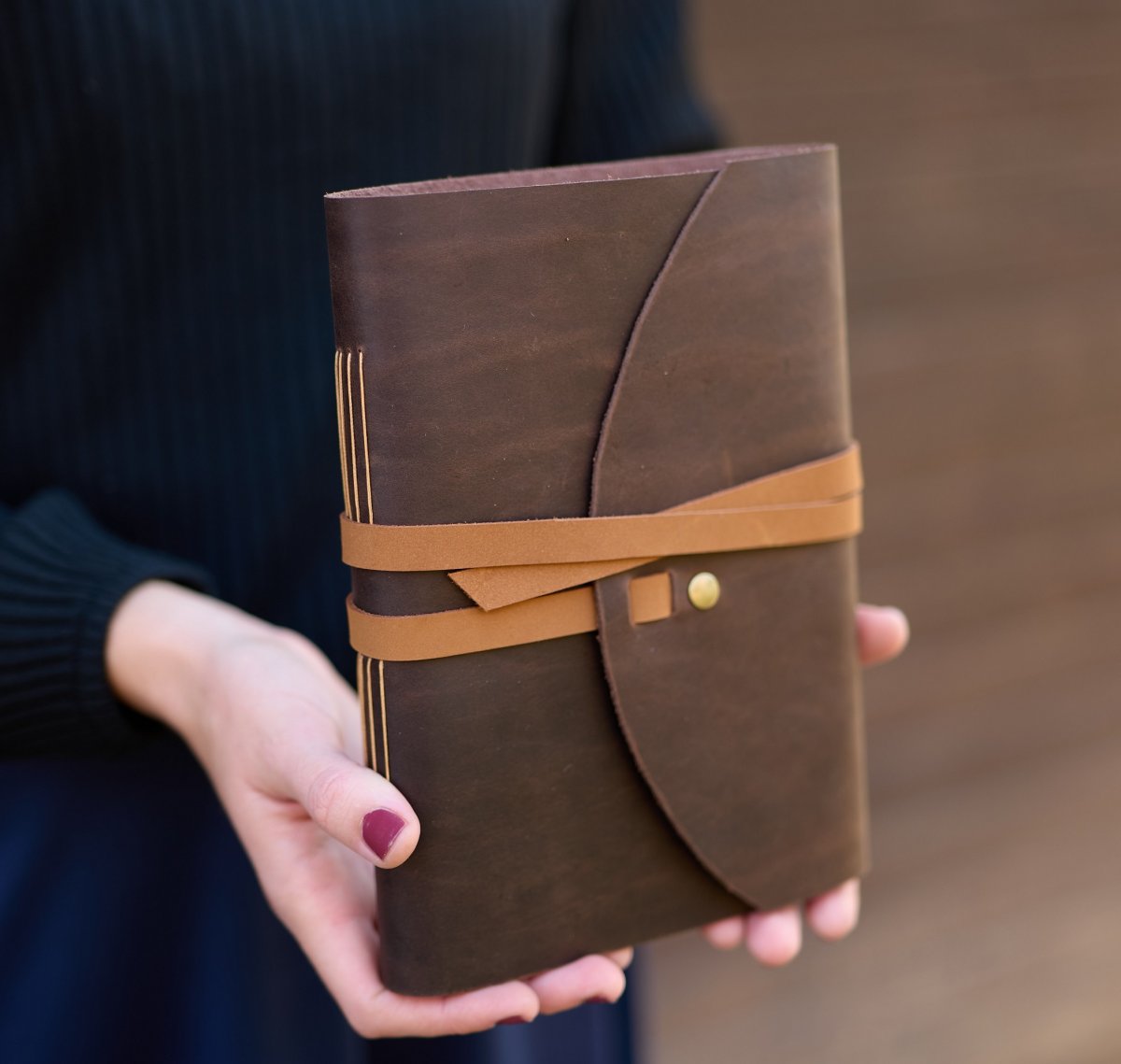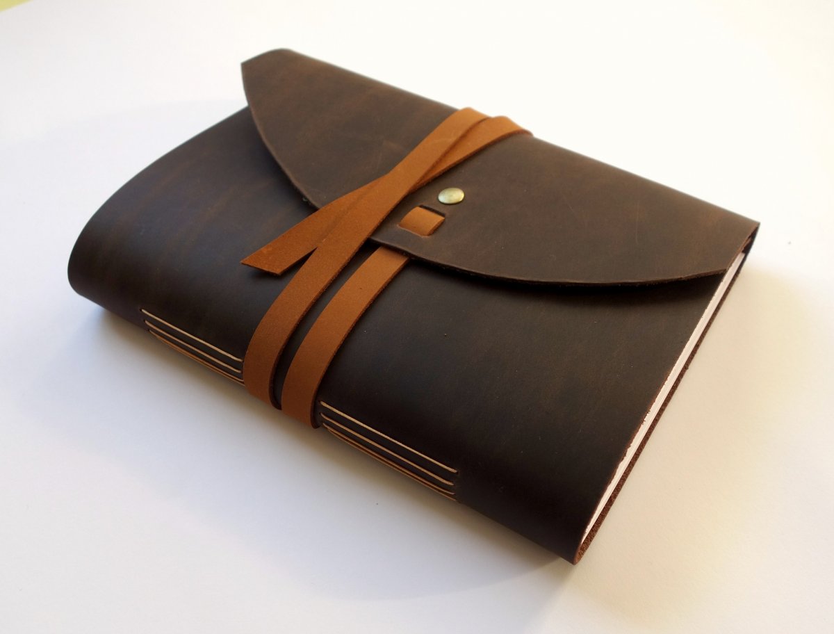 Ručne šitý kožený zápisník v tmavohnedom odtieni s hnedými doplnkami vo formáte A5. Obsahuje 5 blokov bieleho 100-gramového papiera po 40 strán (spolu 200 strán). Strany v zápisníku sú čisté a hrubšie ako klasický papier, preto sú vhodné ako na písanie tak na skicovanie .