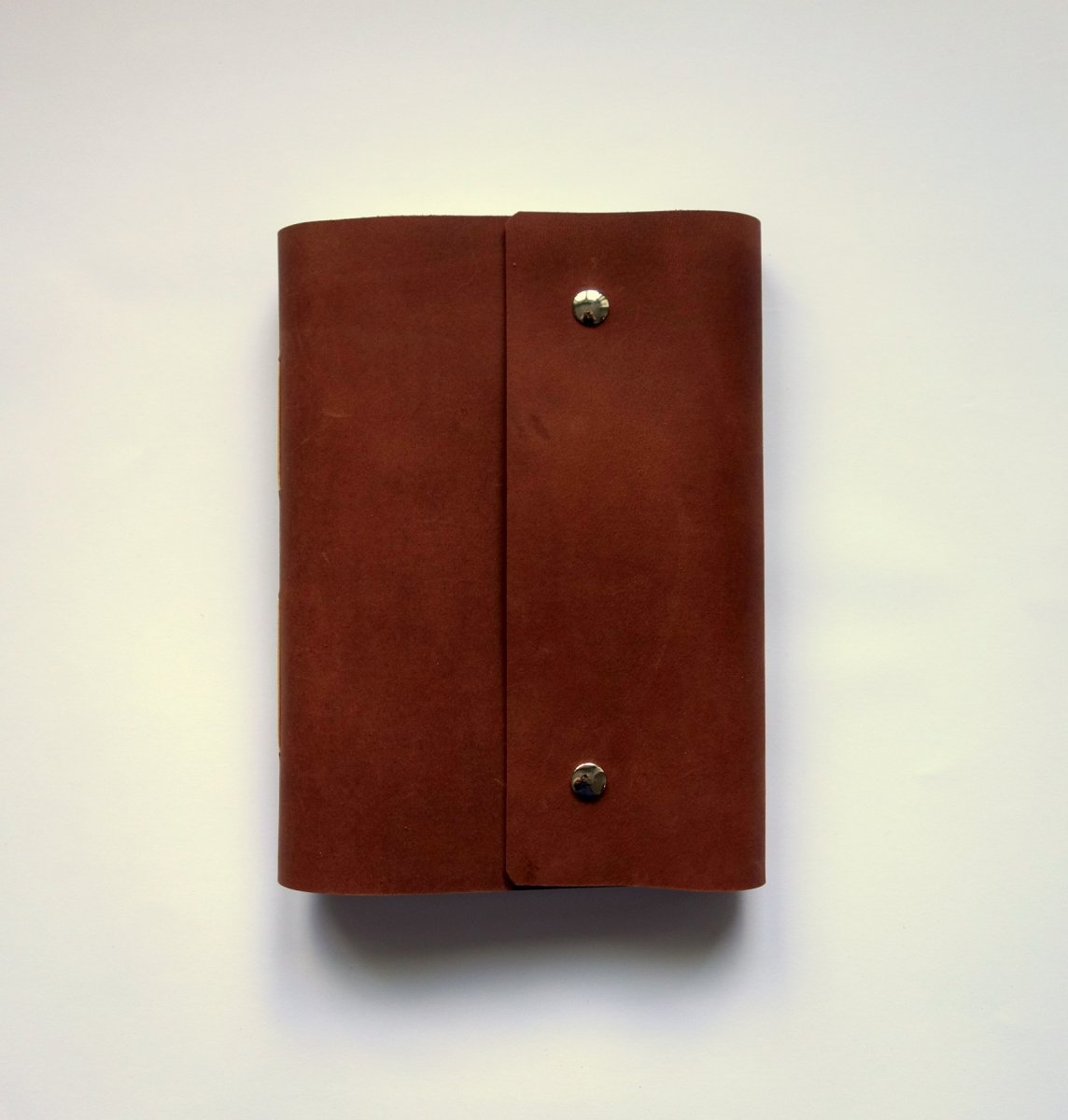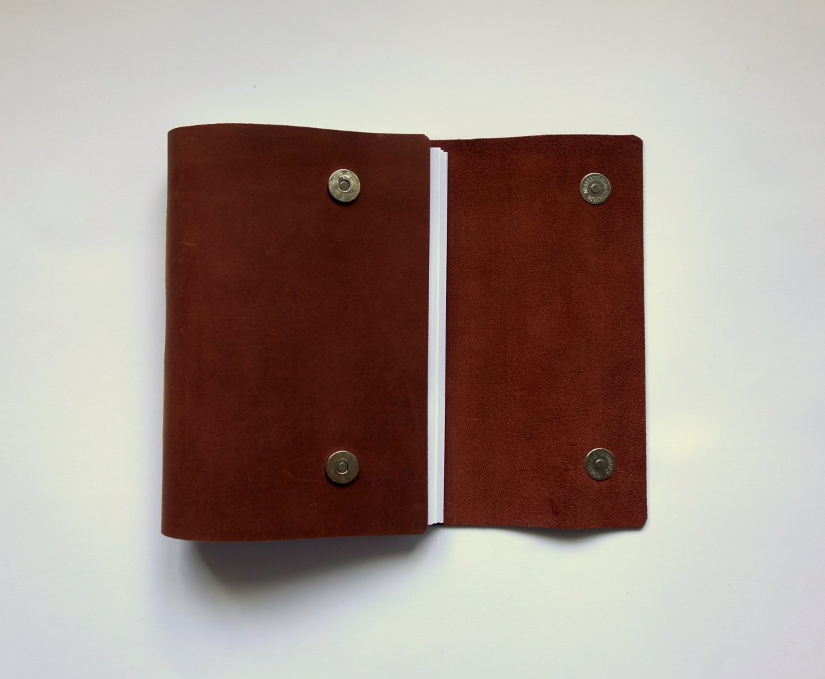 Ručne šitý kožený zápisník v gaštanovohnedej farbe s 2 magnetmi na zatváranie.
