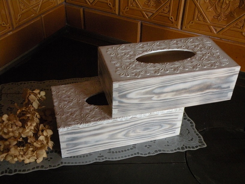Krabička, box na papírové kapesníky se zvýrazněnou kresbou dřeva a reliéfy a perleťovým nádechem.