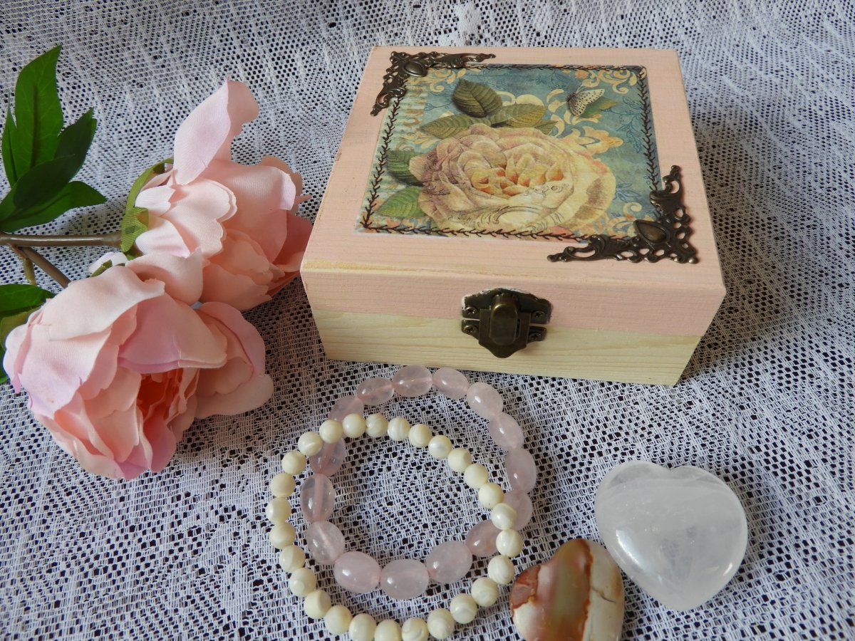 Krabička dřevěná na poklady, šperky,kameny, vzpomínkové věci a pod. zdobena vintage motivem a dvěma filirgány jako krásný dárek z lásky,k narozeninám, svátku, výročí či jen tak pro radost, který doplníte třeba pralinkami, kamínky, šperkem.. o velikosti cca 12x12x4,5cm.