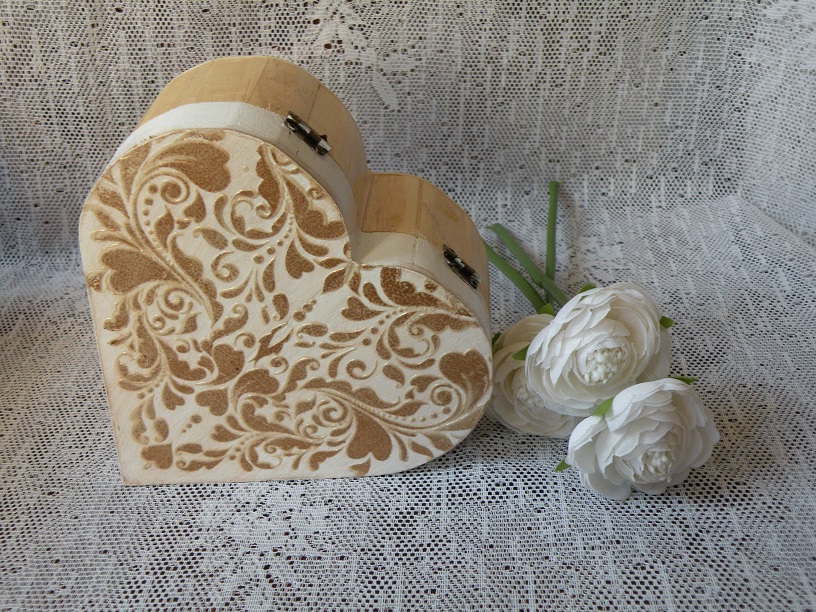 Krabička, šperkovnička, dárková, svatební dekorována reliéfními motivy, které jsou zvýrazněny lehce bronzovou barvou...uvnitř nelakováno, lze tedy nalepit svoji fotku, obrázek a pod...