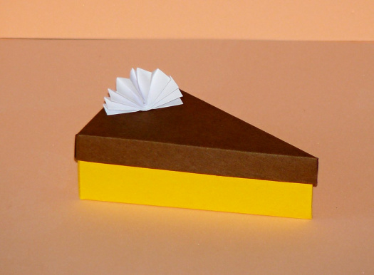Jednoduchá lepená krabička s víčkem ve tvaru zákusku. Víčko hnědé "čokoládové", spodní díl žlutý "piškotové těsto". Ozdobeno "papírovou šlehačkou :-D