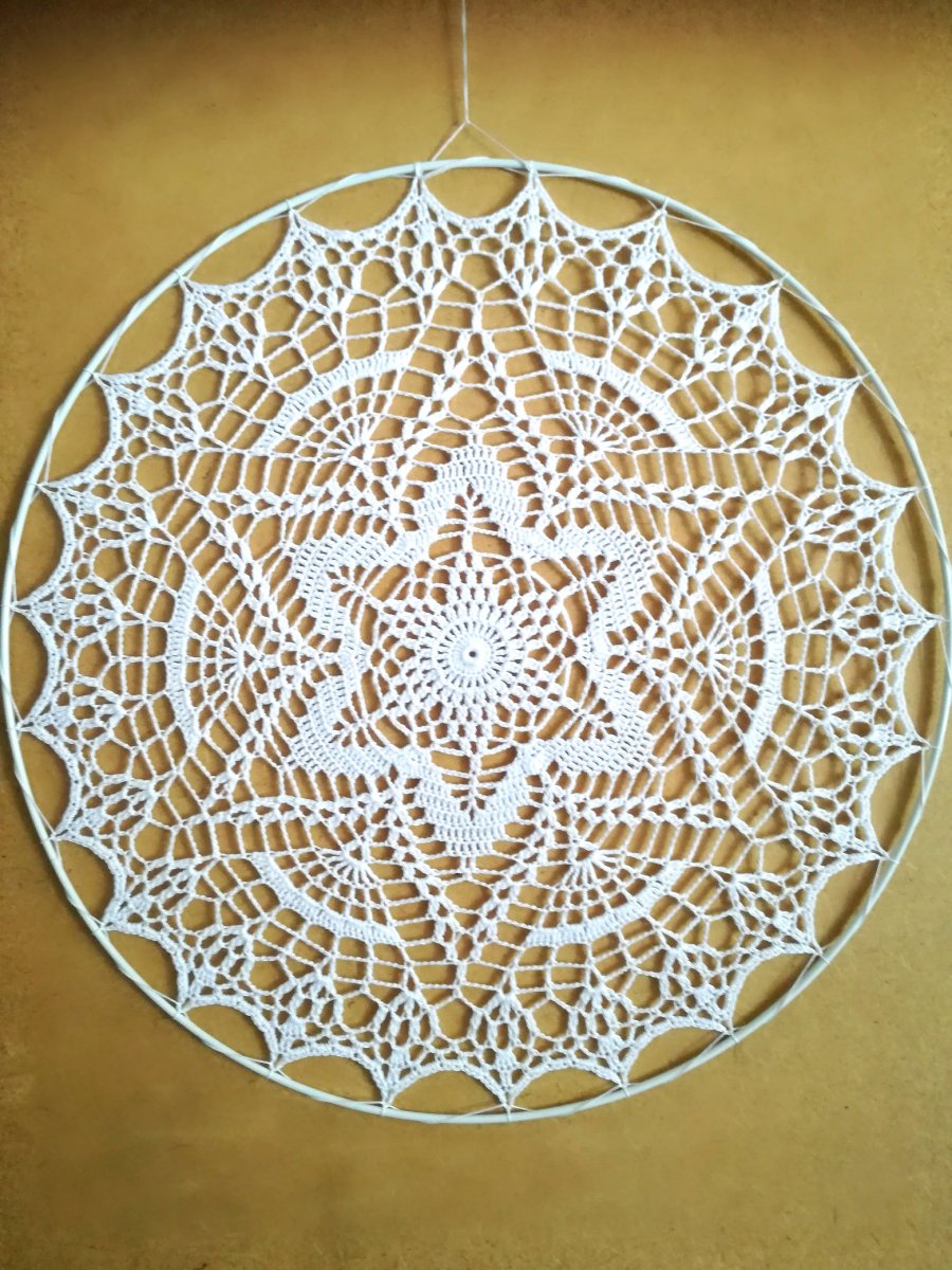 Dekorace na zeď, okno, dveře, nebo jako dečka na stůl, či jako pavučinka do lapače snů - háčkovaná s láskou! Kraječku po uháčkování vždy lehce škrobím a vytahuji přímo do bílého kovového kruhu o průměru 35 cm, aby se krásně a souměrně vypnula, po uschnutí a napnutí jí opět sundavám a tak je připravena k prodeji (bez kovového kruhu)