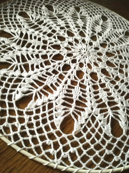Dekorace na zeď, okno, dveře, nebo jako dečka na stůl, či jako pavučinka do lapače snů - háčkovaná s láskou! Kraječku po uháčkování vždy lehce škrobím a vytahuji přímo do bílého kovového kruhu o průměru 35 cm, aby se krásně a souměrně vypnula, po uschnutí a napnutí jí opět sundavám a tak je připravena k prodeji (bez kovového kruhu)