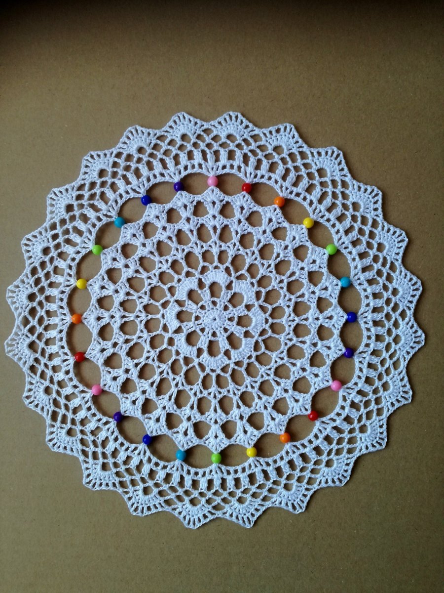 Dekorace na zeď, okno, dveře, nebo jako dečka na stůl, či jako pavučinka do lapače snů - háčkovaná s láskou! Kraječku po uháčkování vždy lehce škrobím a vytahuji přímo do bílého kovového kruhu o průměru 25 cm, aby se krásně a souměrně vypnula, po uschnutí a napnutí jí opět sundavám a tak je připravena k prodeji (bez kovového kruhu)