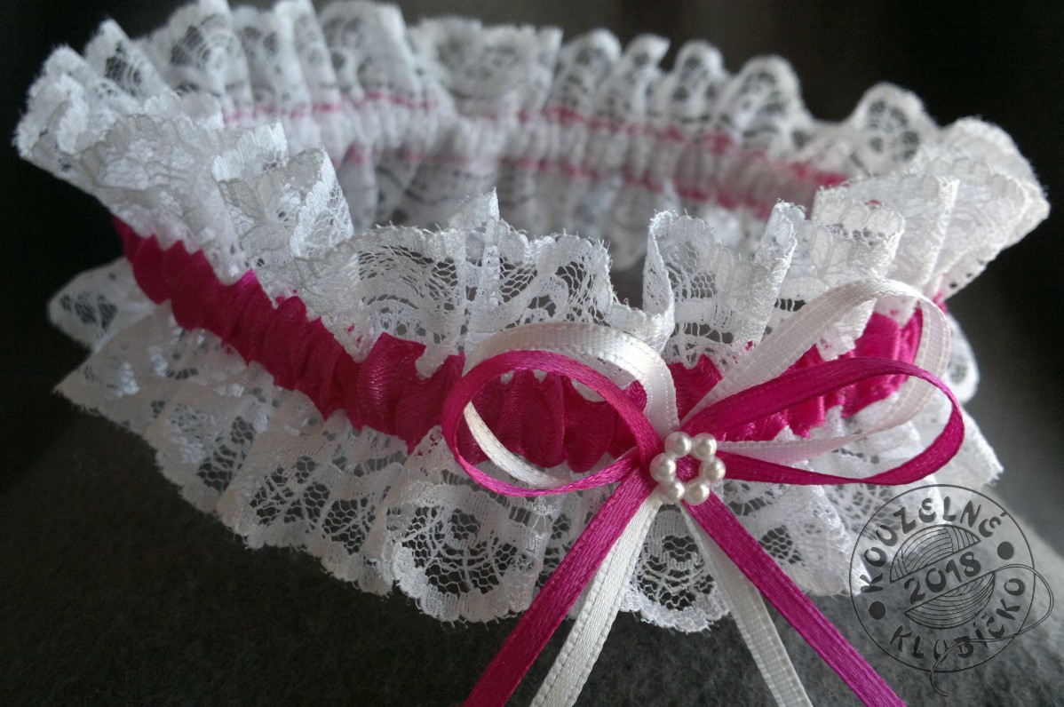 Jemný krajkový podvazek zdobený fuchsiově růžovou saténovou stuhou, mašličkou ze stužek a perleťovým věnečkem (kolečkem).