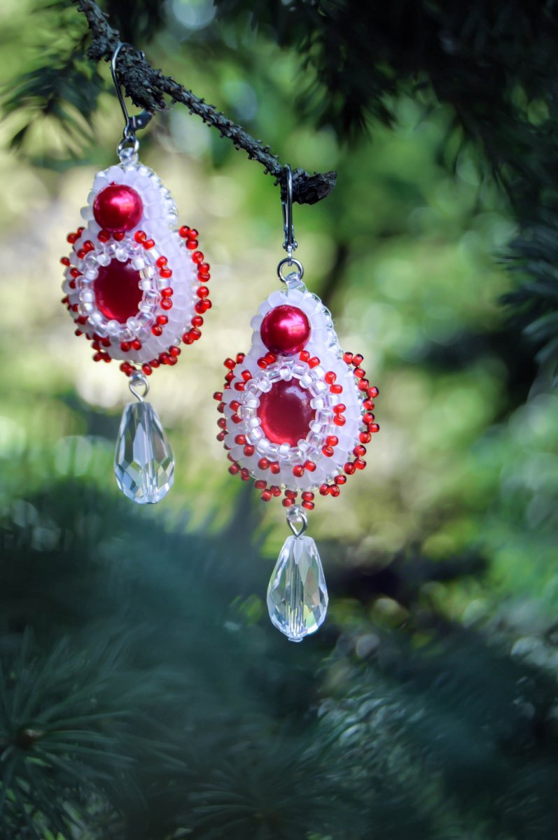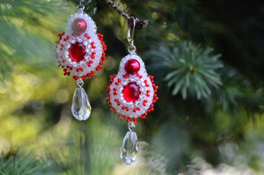 Náušnice jsou tvořeny z oválných kabošonů, které jsou obšity japonskými korálky TOHO, českými korálky, šité na semišovém podkladu a podloženy kartonem aby drželi tvar. To celé je zakončené broušenými skleněnými korálkami ve tvaru kapky.