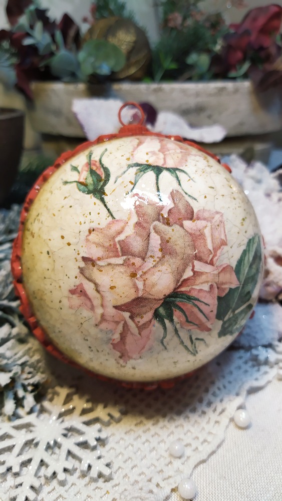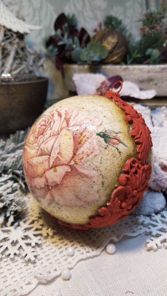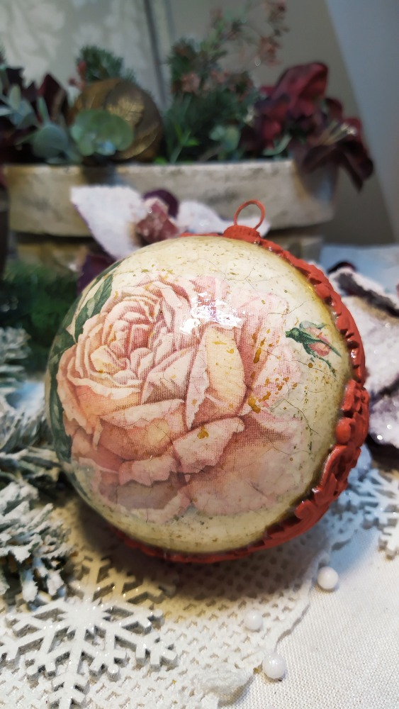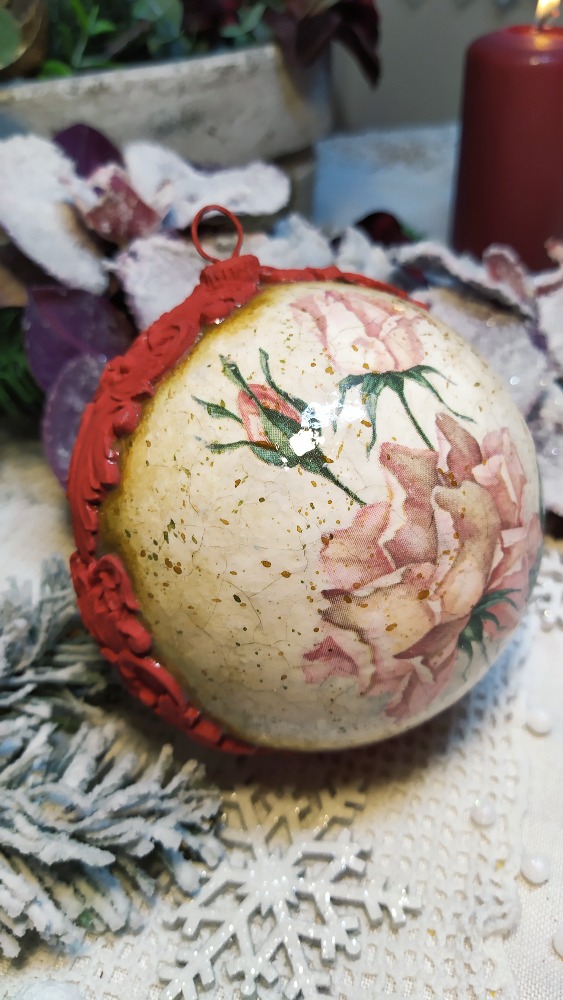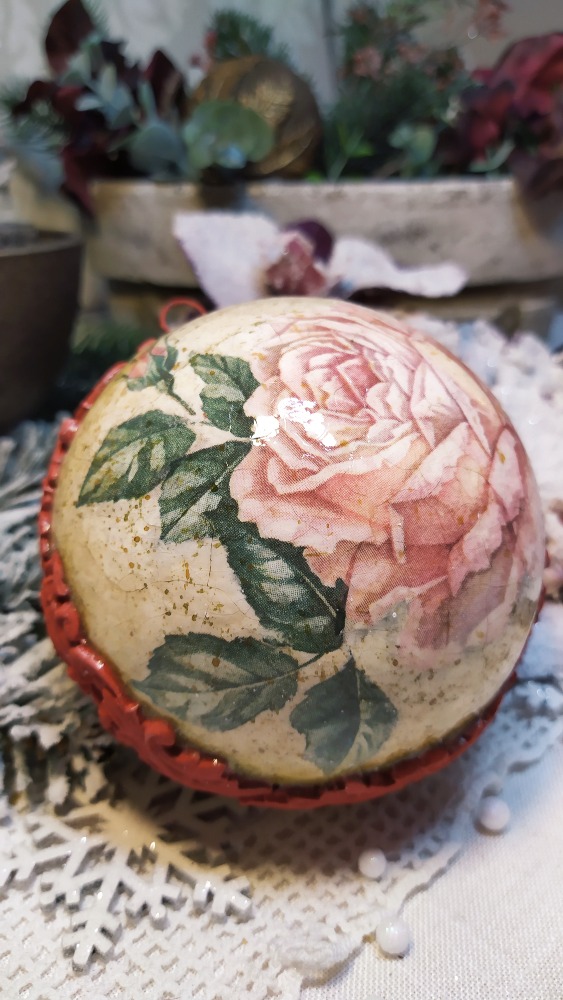 Vánoční ozdoba ve tvaru koule s motivem krásné velké růžové růže. Koulička je krakelovaná a lakovaná lesklým lakem. Po obvodu je dekorovaná reliéfní červenou bordurou. Vhodná na vánoční stromeček nebo stůl s dekorací.