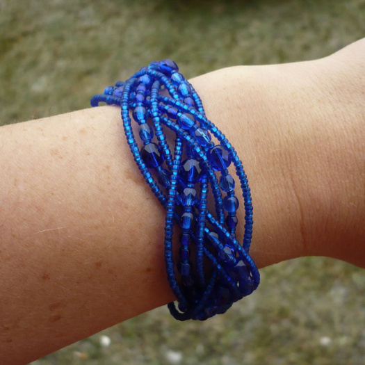 Náramek je tvořený z propletených řad z královsky modrých skleněných korálků.