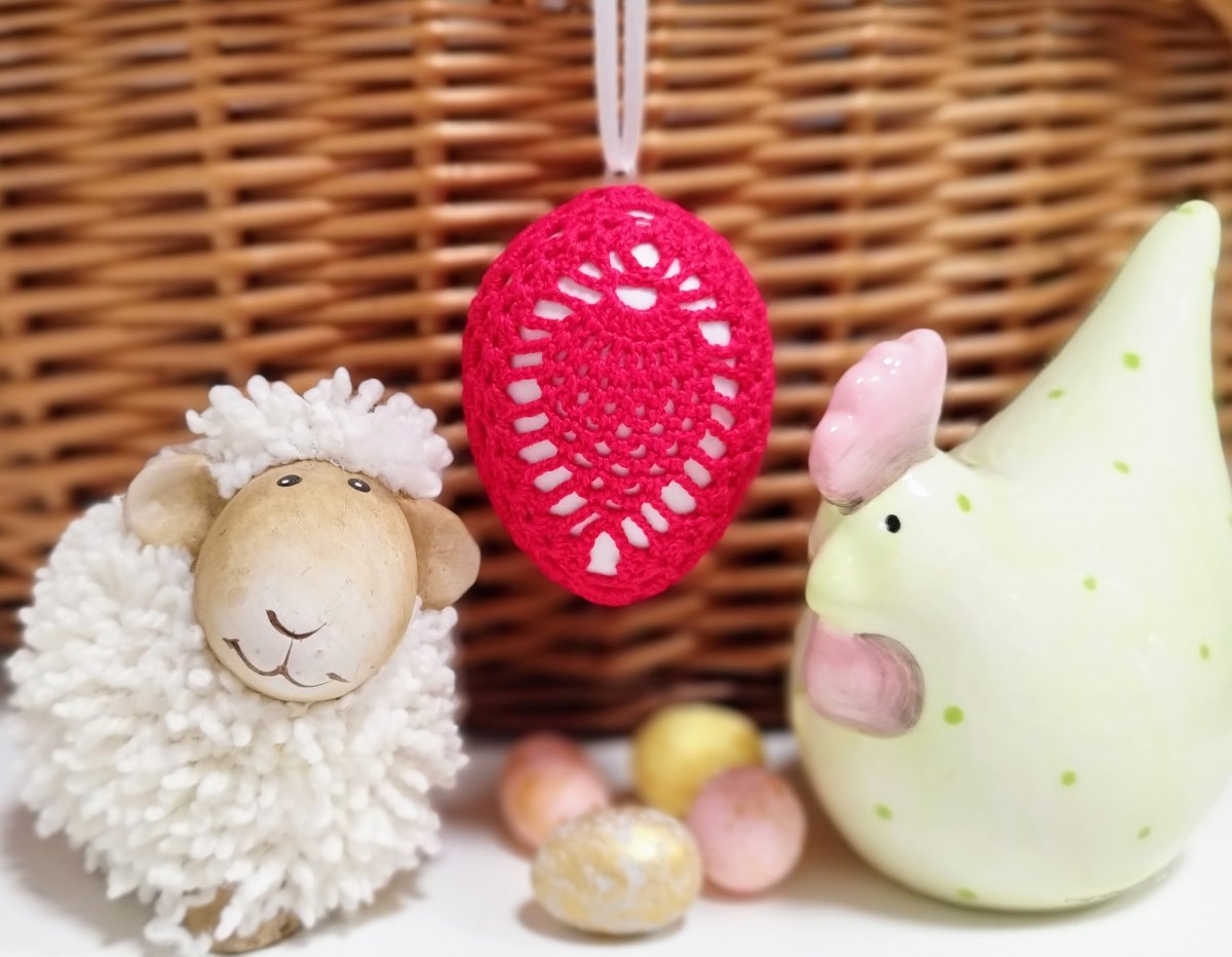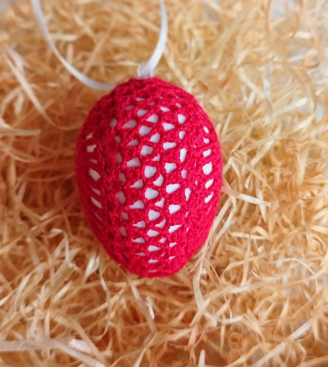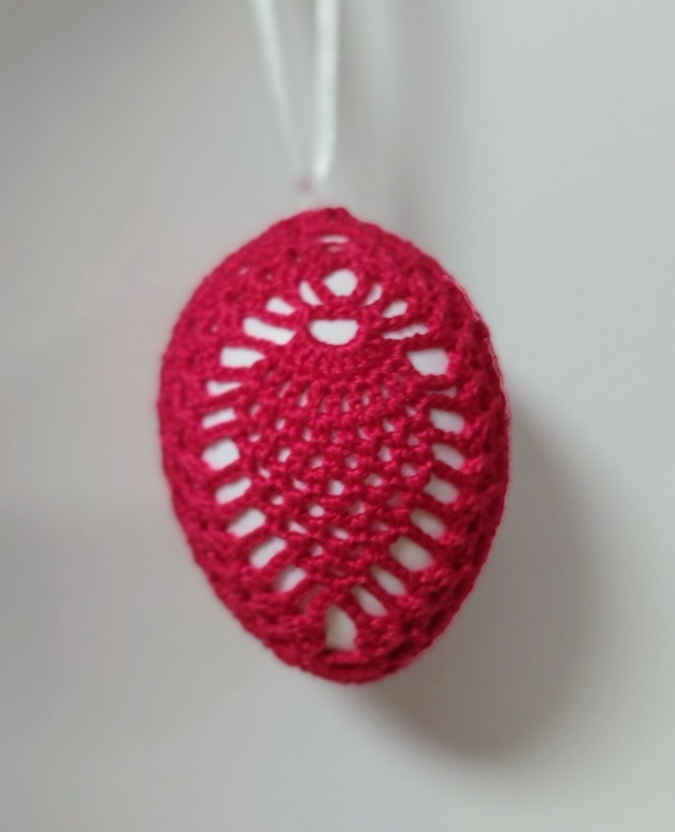Bílé plastové vajíčko, obháčkované červenou přízí. Vajíčko je plastové proto, aby se nerozbilo a celá práce se rychle nezničila.