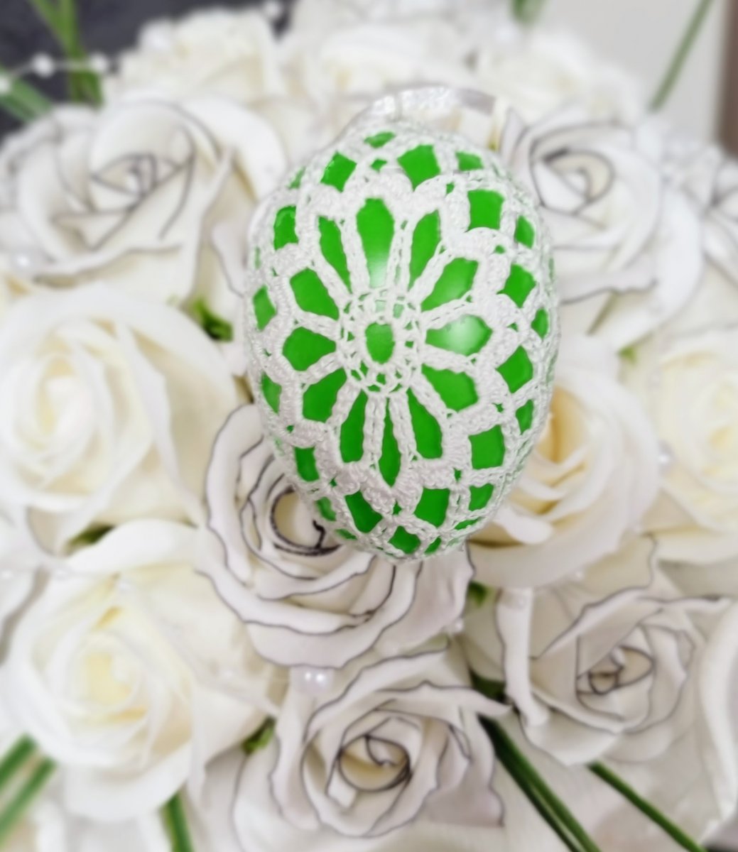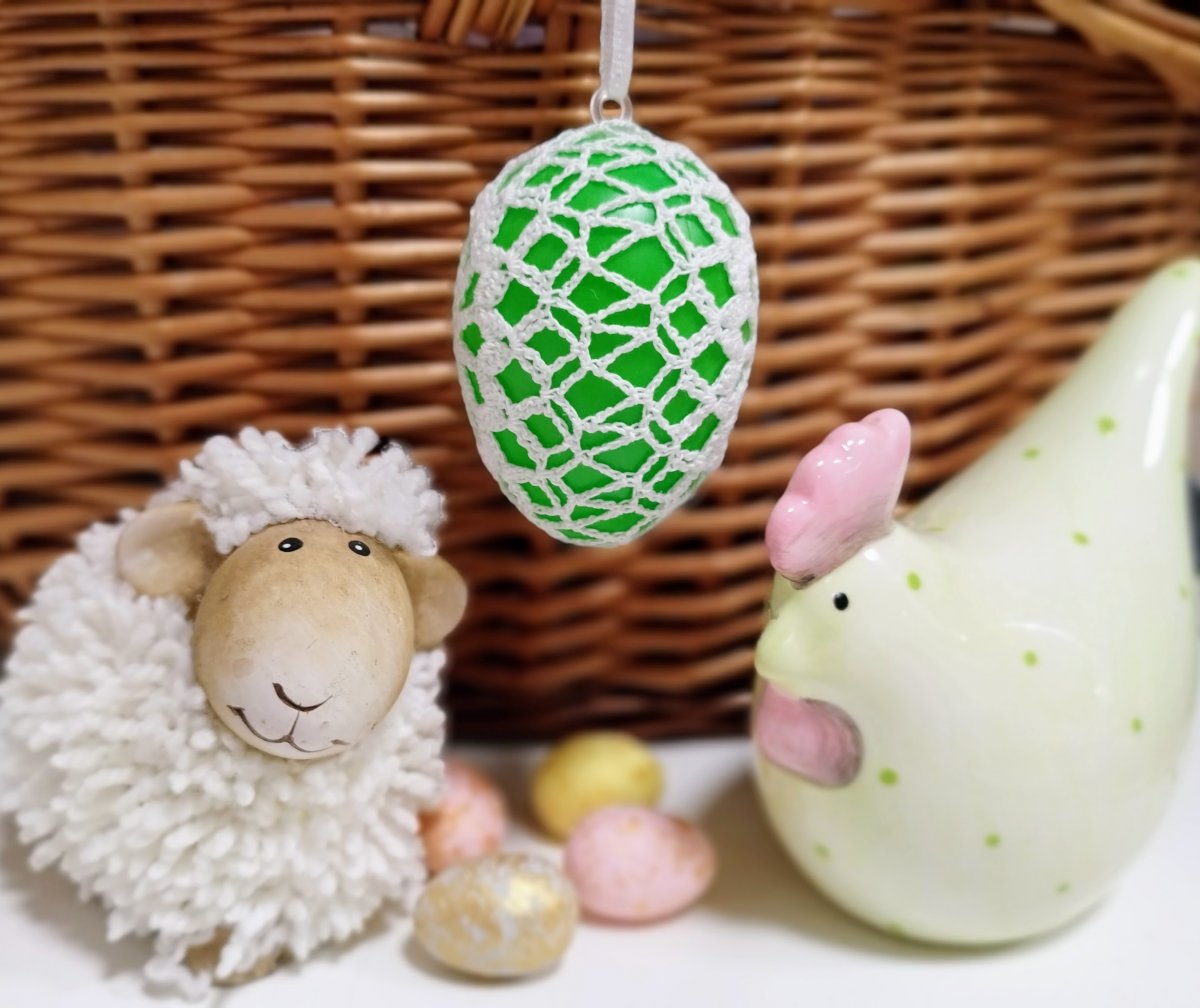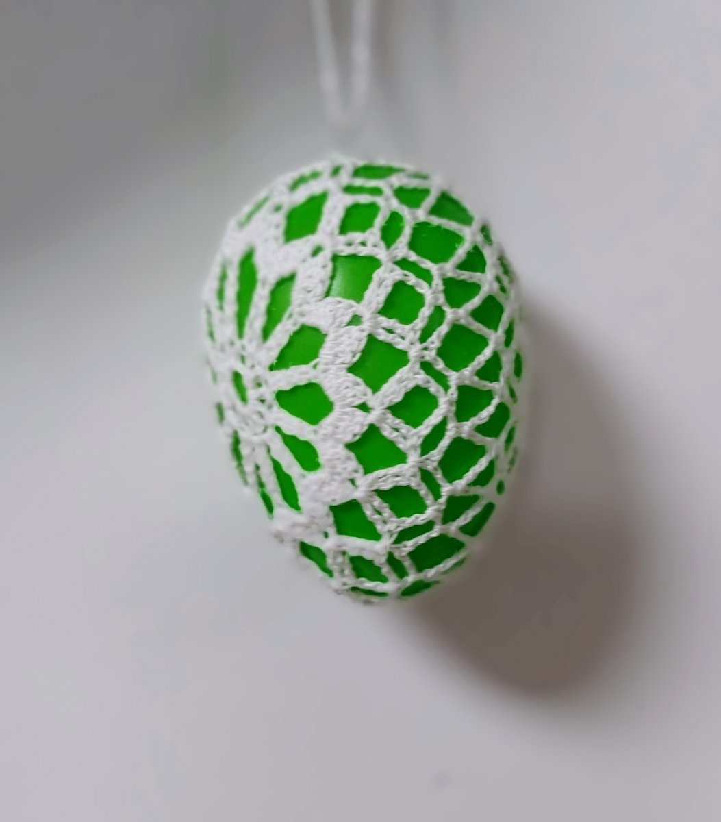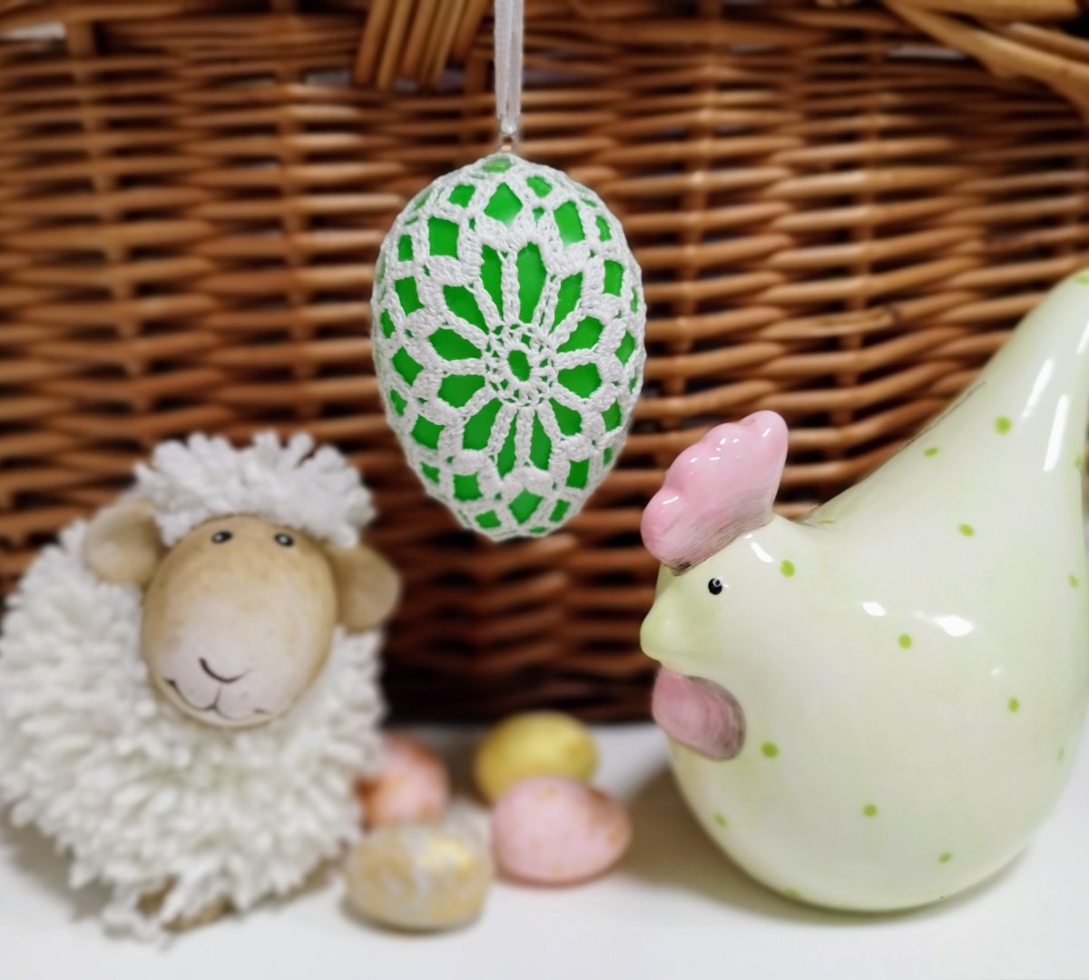 Zelené plastové vajíčko, obháčkované bílou přízí. Vajíčko je plastové proto, aby se nerozbilo a celá práce se rychle nezničila.
