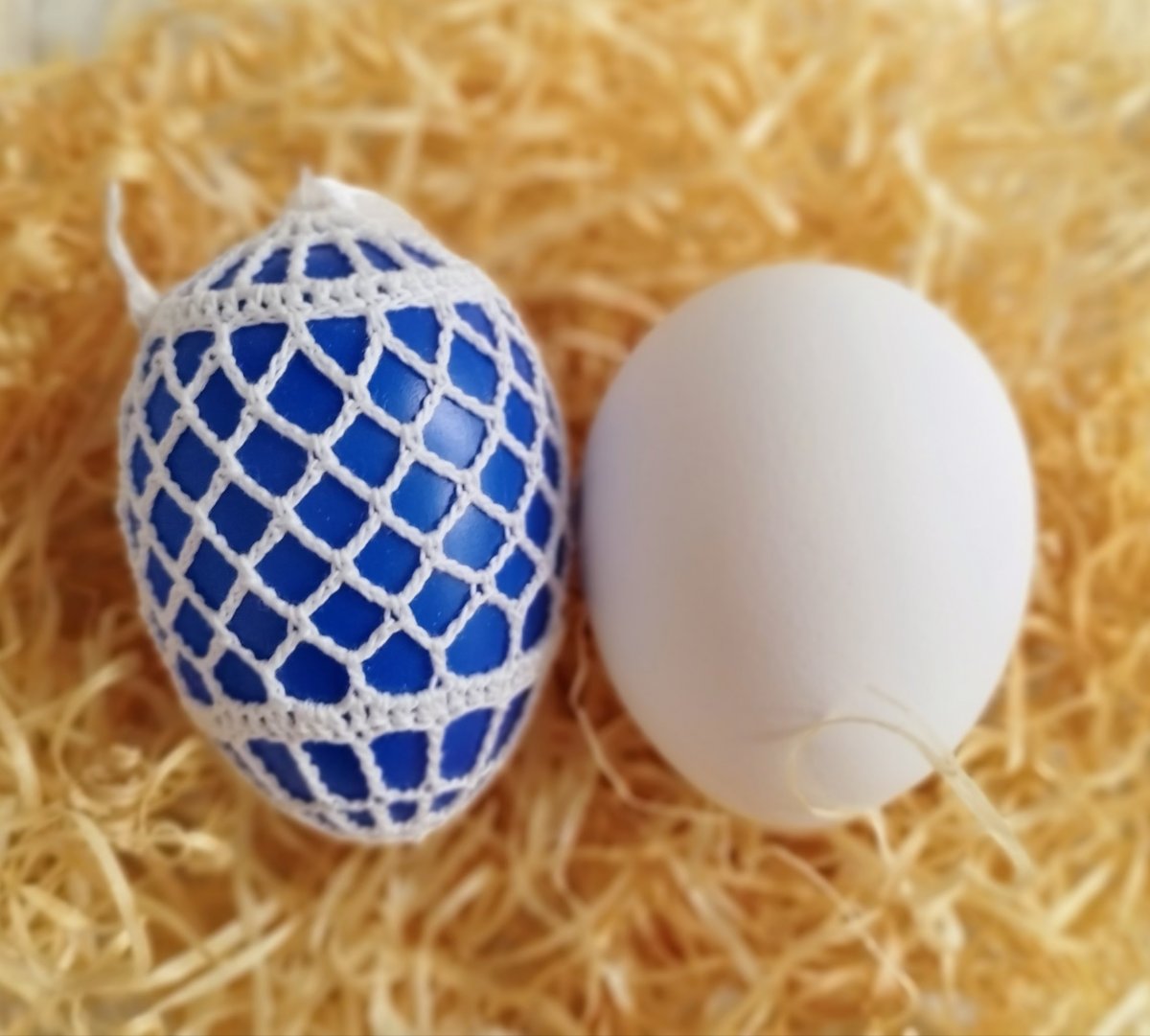 Modré plastové vajíčko, obháčkované bílou přízí.