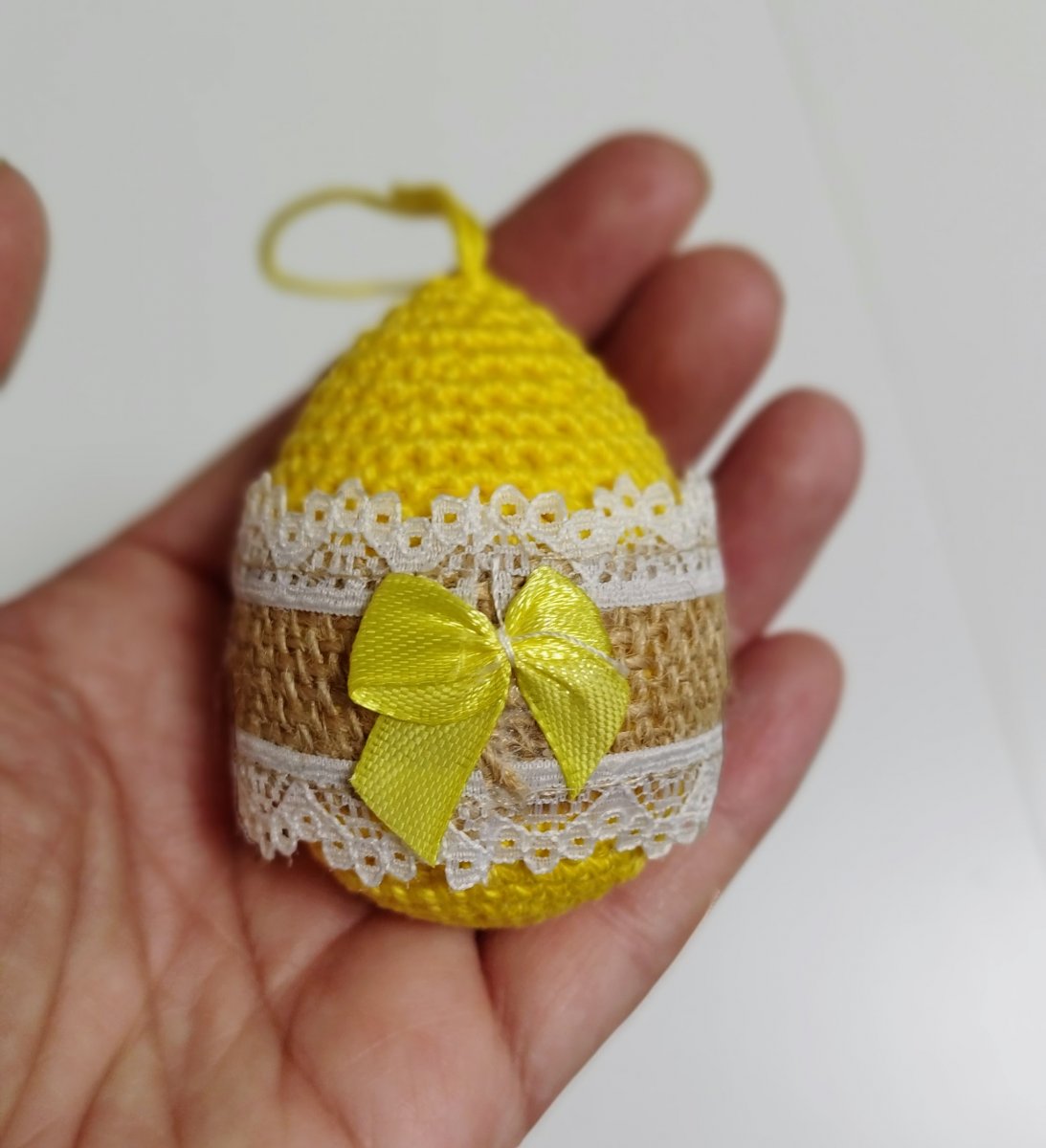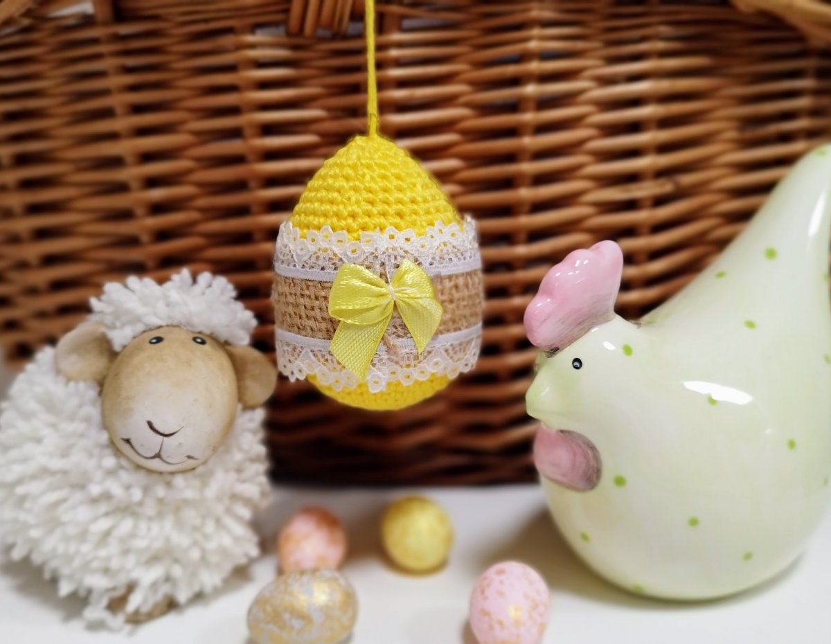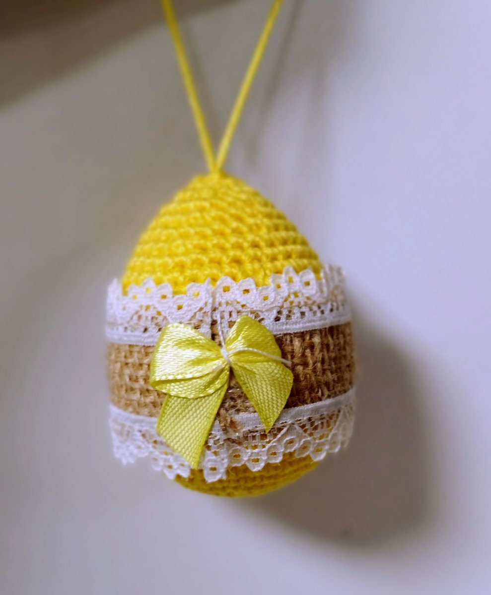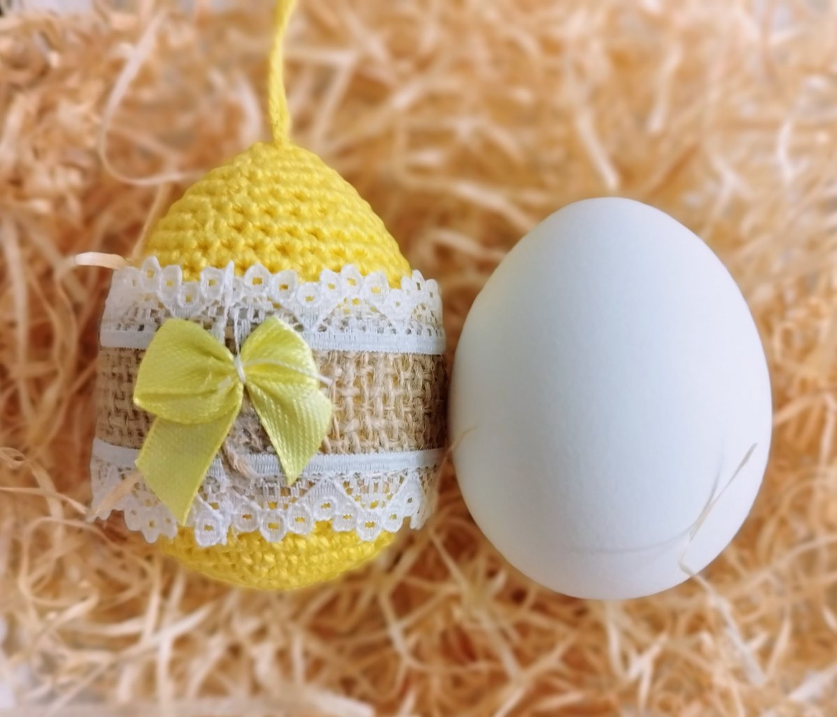 Plastové vajíčko, obháčkované žlutou přízí a ozdobené.