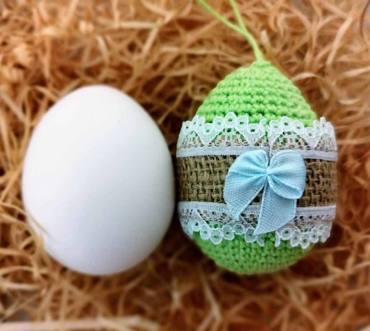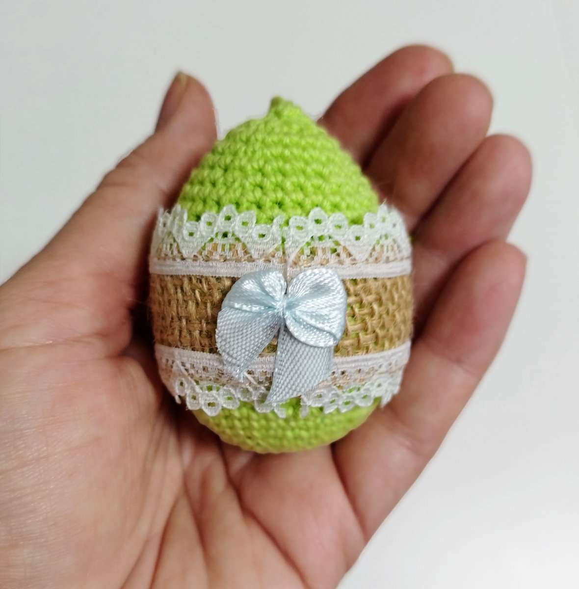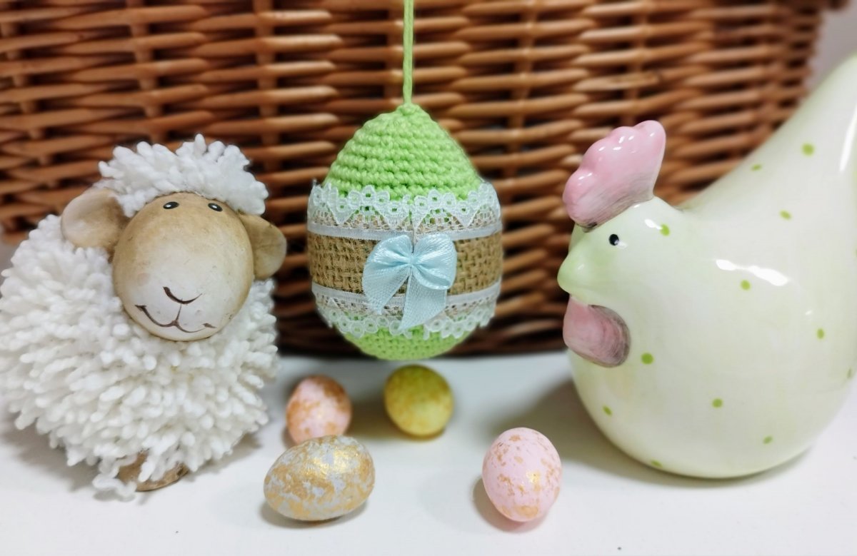 Plastové vajíčko, obháčkované zelenou přízí a ozdobené.