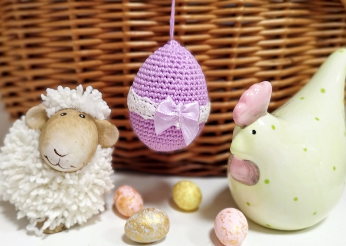 Plastové vajíčko, obháčkované fialovou přízí a ozdobené.