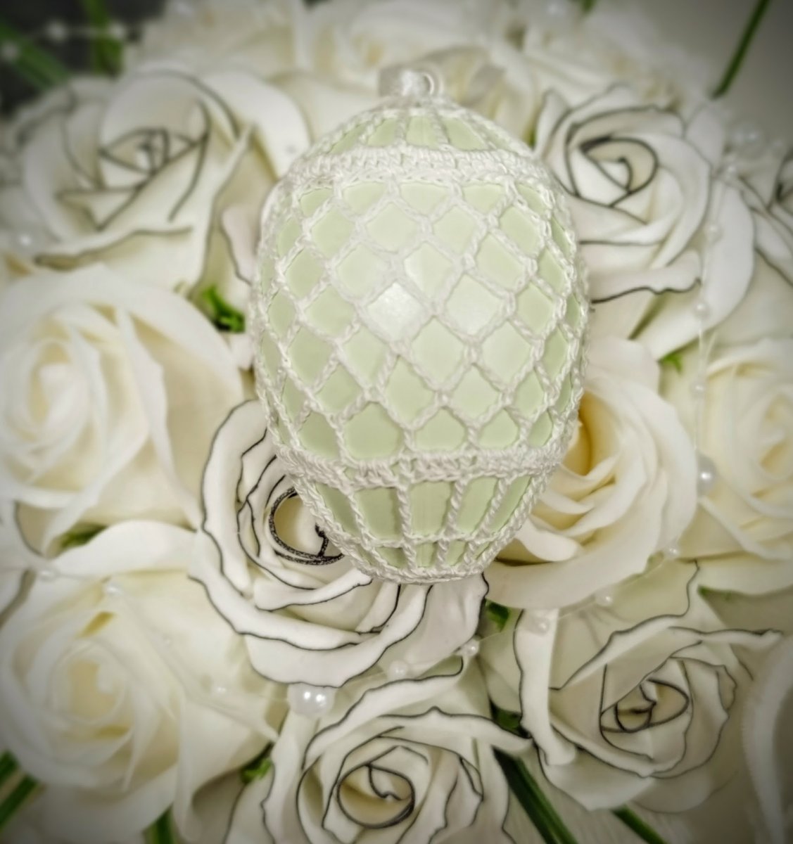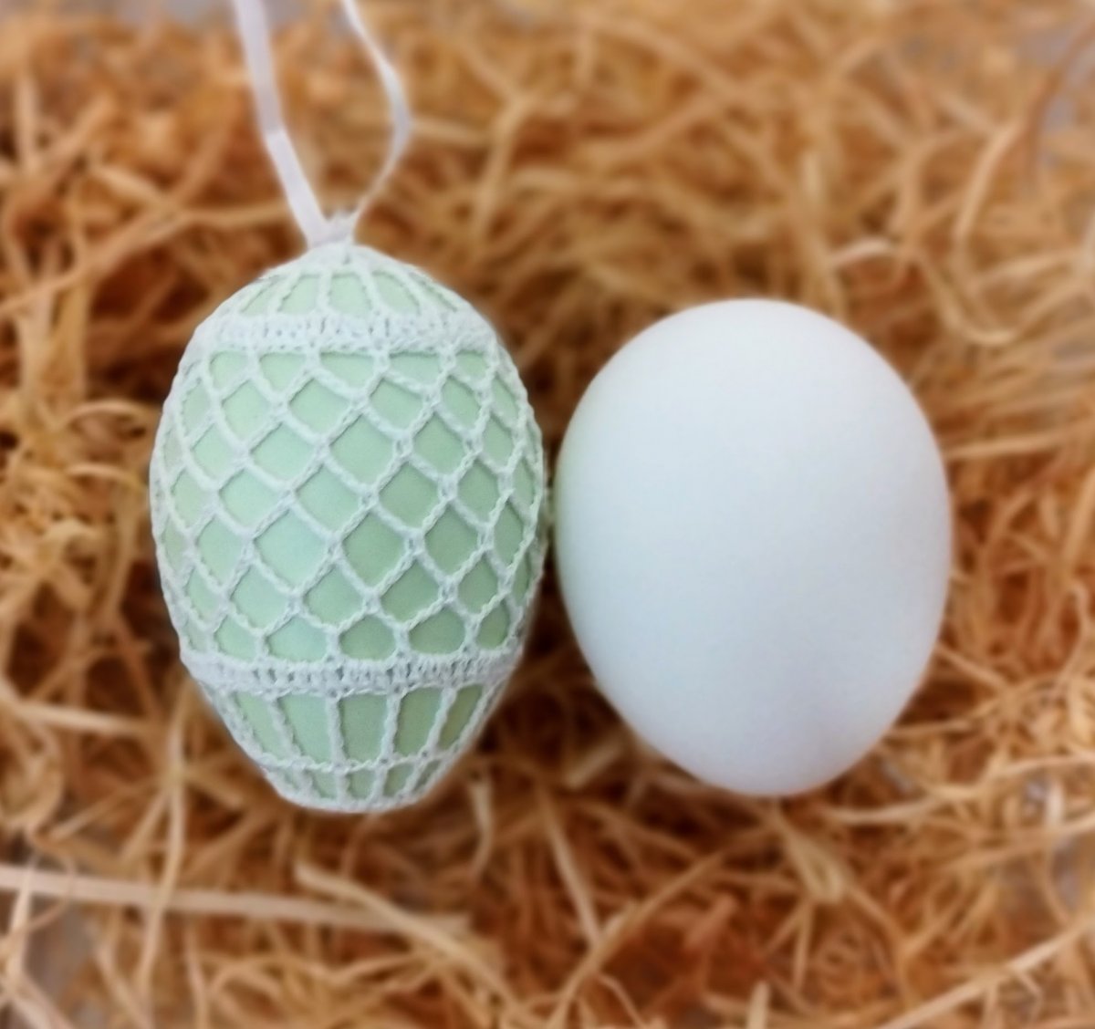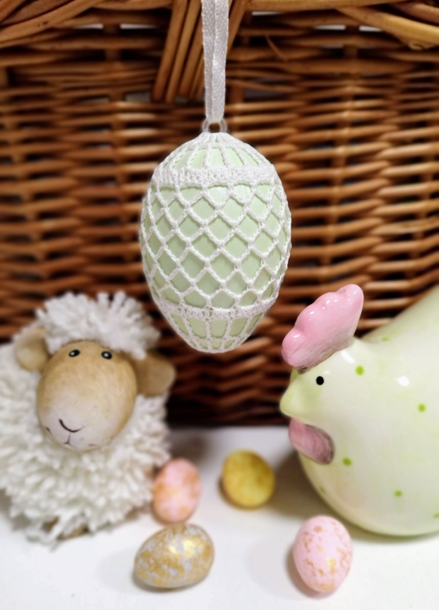 Světlounce pastelově zelené plastové vajíčko, obháčkované bílou přízí.