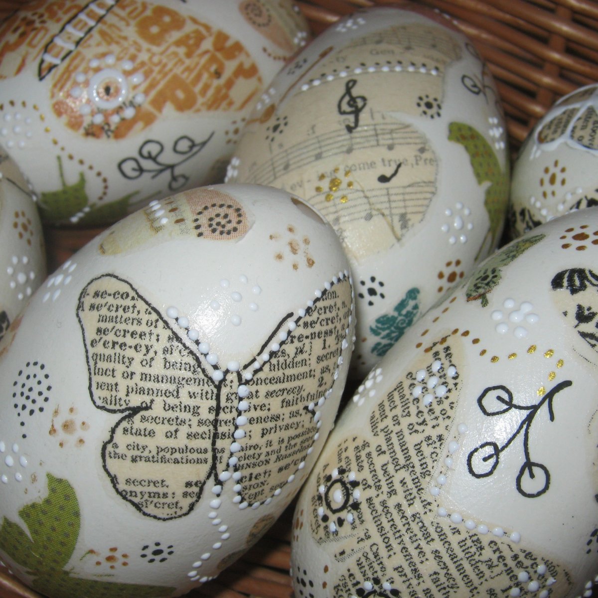 Kraslice z husích vajec zdobené decoupage technikou a dokreslené konturovací barvou a akrylovými fixami.