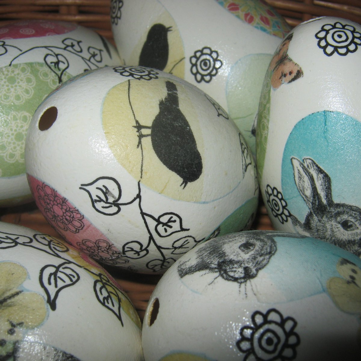 Kraslice z husích vajec zdobené decoupage technikou a dokreslené akrylovou fixou.