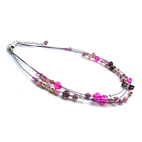 Náhrdelník je tvořený z tří řad fialového bižuterního lanka, na kterém jsou navlečeny v nepravidelných odstupech od sebe různě veliké korálky v barvách krémové, růžové a fialové. Obvod náhrdelníku je nastavitelný od 29 do 34,5 cm, takže s Vaší malou holčičkou i roste :-). Zapínání je na karabinku a prodlužovací řetízek. Použité kovové komponenty jsou z obecného kovu a stříbrné barvy. Obdobný jsem na přání dělala pro holčičku, která šla do první třídy, aby jí to ještě více slušelo :-). Pokud si budete přát jinou barevnou kombinaci či doplnění o náušnice, neváhejte mě kontaktovat, ráda výjdu Vašemu přání vstříc. ! Není vhodný pro děti do 6 let!