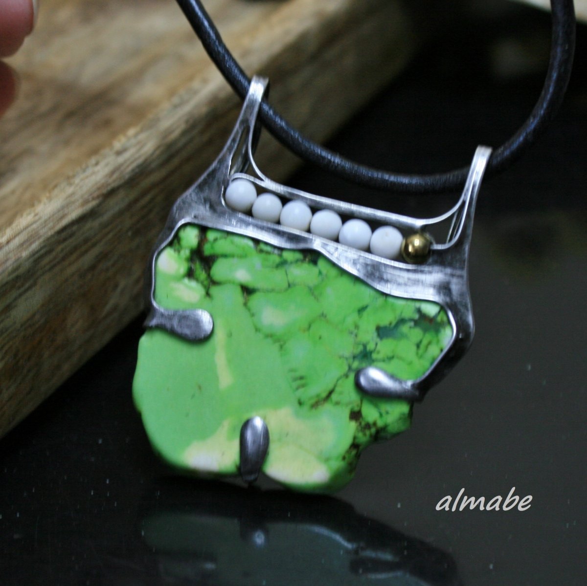 Cínovaný šperk je vytvořen z plátku surového a hlazeného bar. howlitu. Kámen má teplou světle zelenou a bílou barvu, protkanou antracitovými cestičkami a je sametově matný.