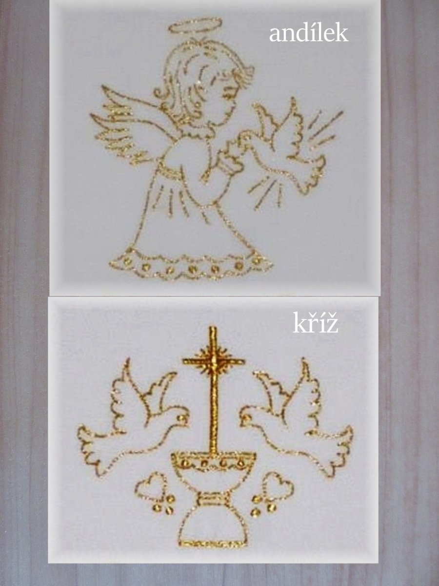 Barvy nití - zlatá, stříbrná. Další barvy viz. foto- vzorník nití.