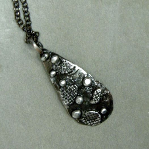 Cínovaný náhrdelník s přívěskem ve tvaru slzy se zajímavým reliéfem. Přívěsek je velký 4 x 1,5 cm a je zavěšený na řetízku, dlouhém 42 cm - lze upravit. Patinováno, leštěno a ošetřeno antioxidantem.