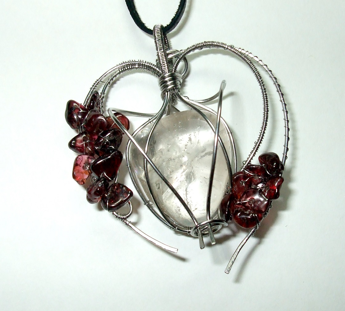 Přívěsek je vyrobený z pravého křišťálu a zlomků Granátů, zasazeno do nerezové oceli. Velikost je 5 x 4.5 cm, k přívěsku posílám zdarma koženou šňůrku na zavěšení.