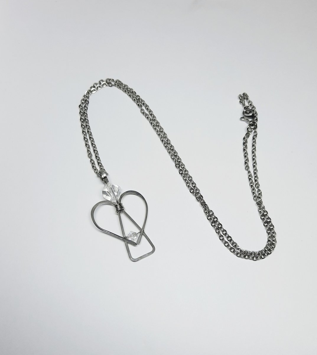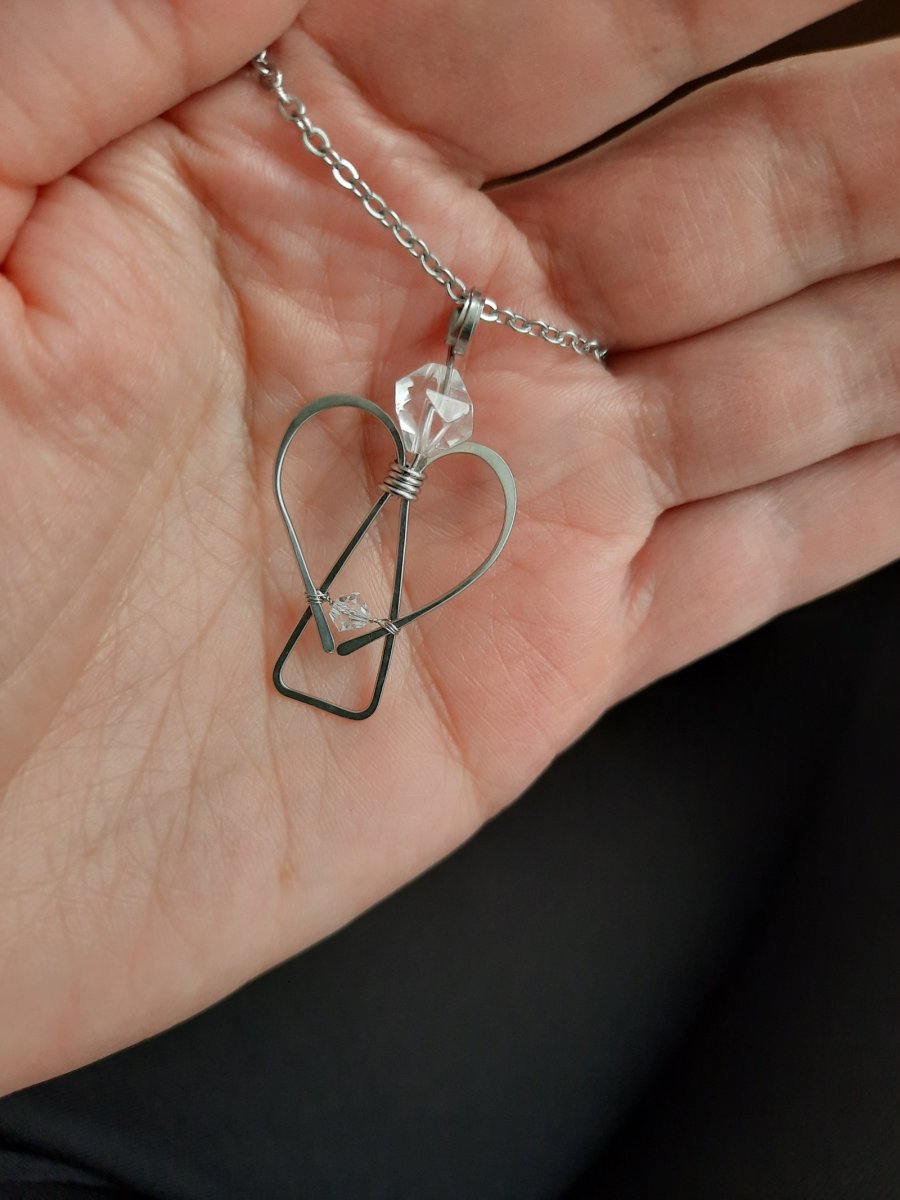 Přívěšek je ručně tepaný z chirurgické oceli ozdobený broušeným křišťálem a maličkým kamínkem Swarovski.