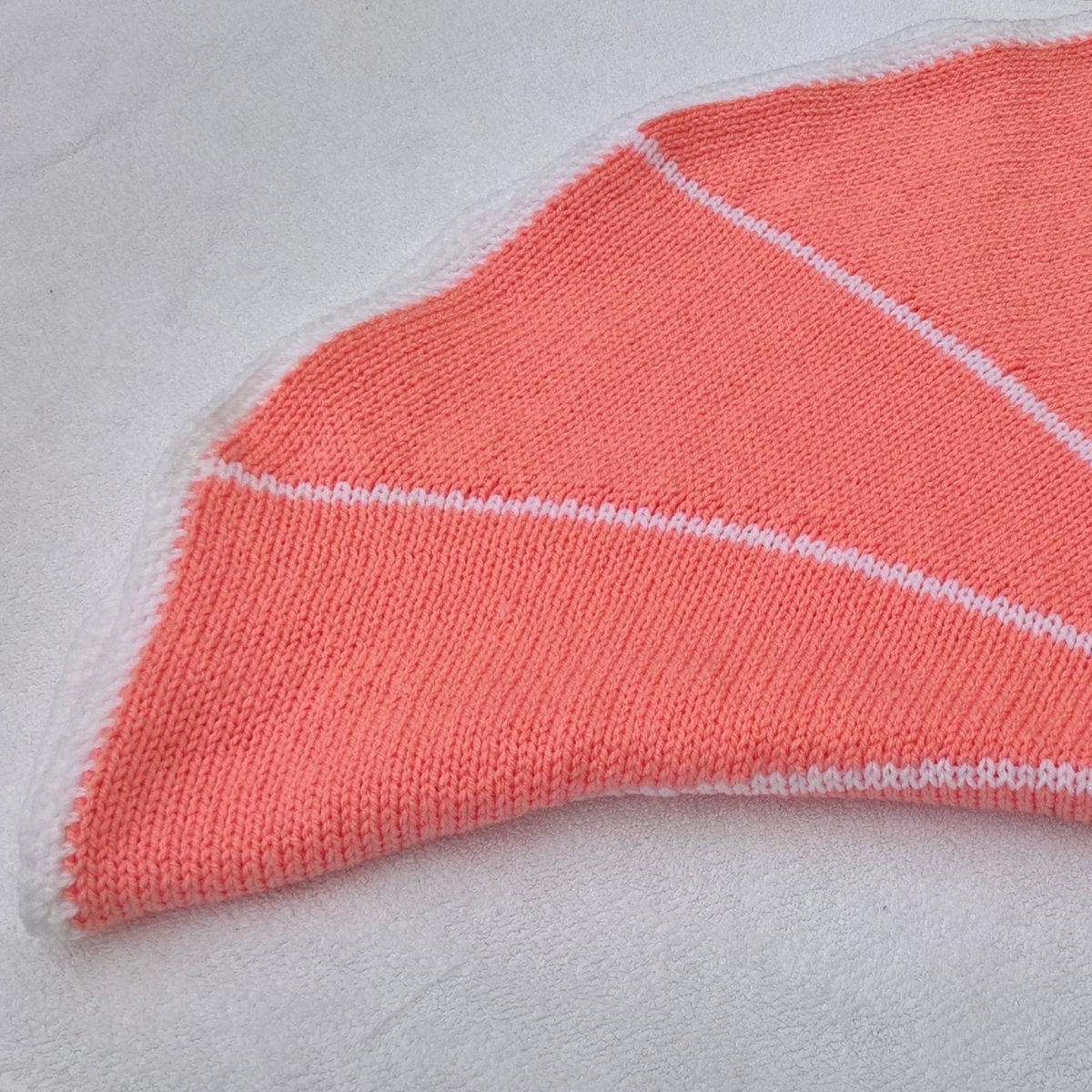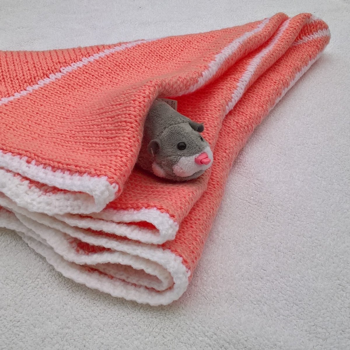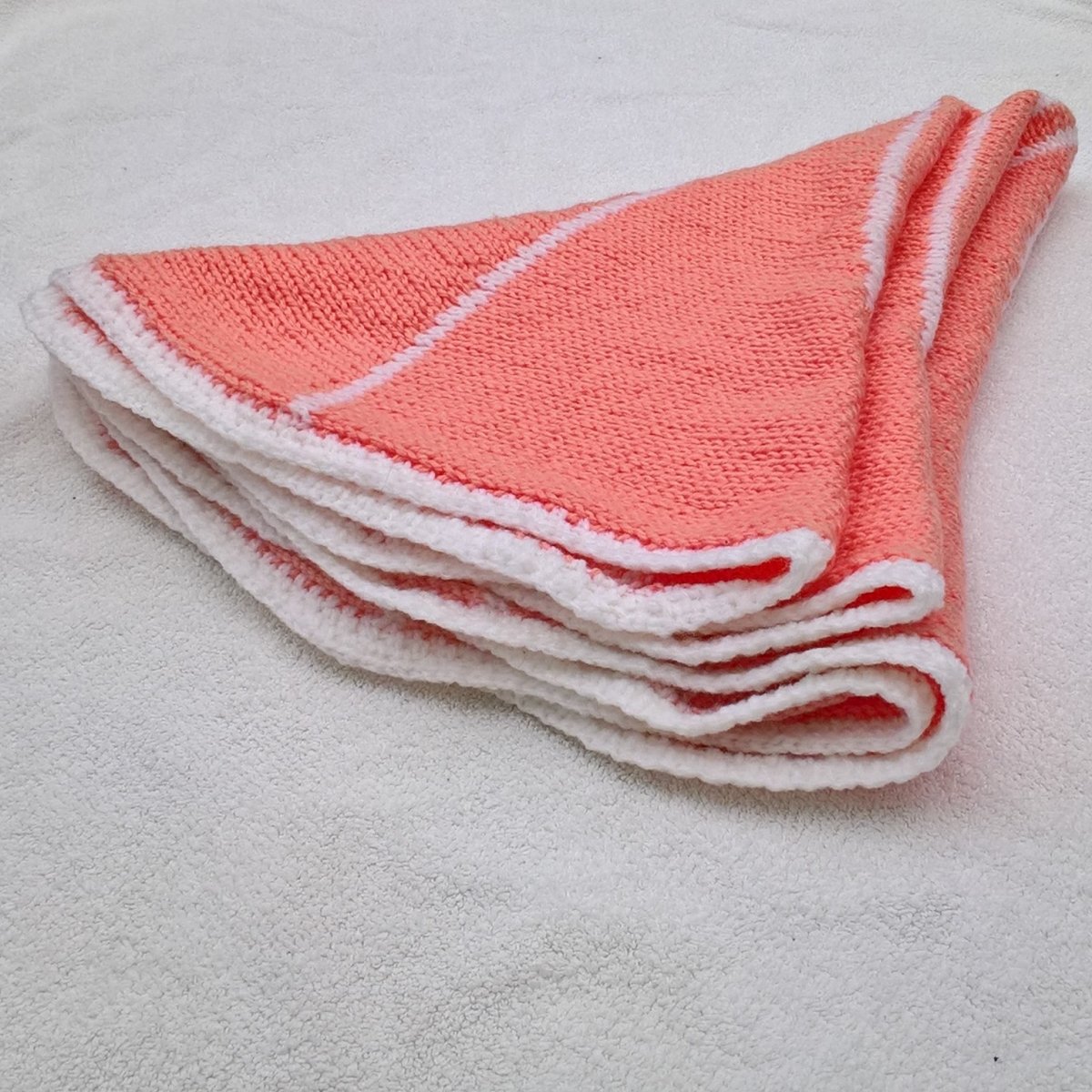 Dětská deka je hladce pletená ze středně silné příze, barva růžová s bílýmy "paprsky". Deka je obháčkována bílou přízí.