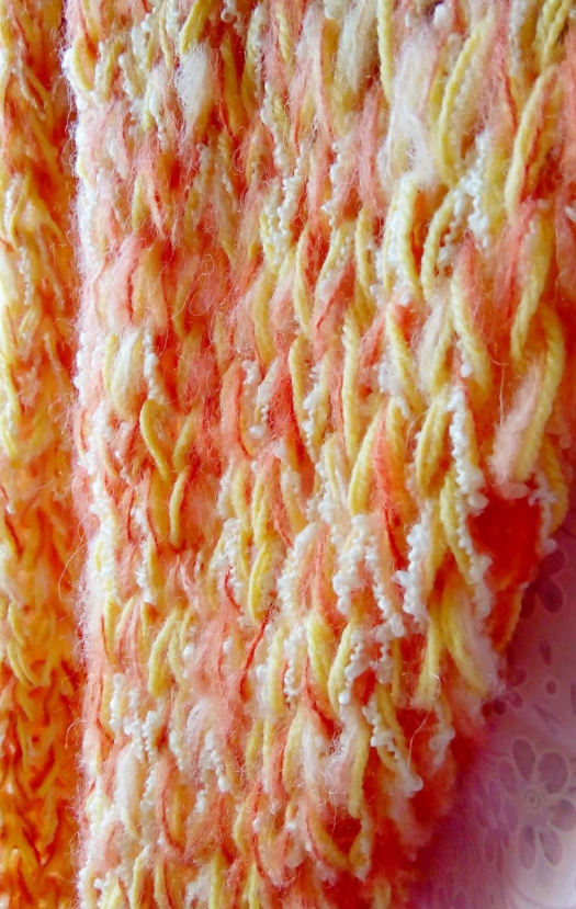 Upleteno z různých druhů přízí (akryl, polyamid, směs, vlna, mohér). Lze 2x omotat kolem krku.