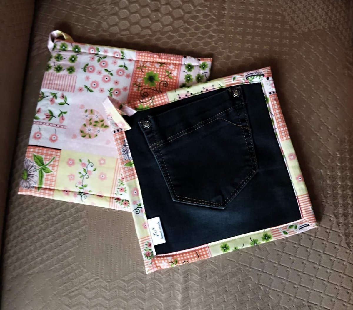 Praktická a stylová chňapka do kuchyně z recyklované rifloviny s kapsou na ruku a bavlněnou látkou na druhé straně. Vnitřní výplň tvoří tepelně odolná netkaná textilie Arachne. Chňapka má poutko na zavěšení.