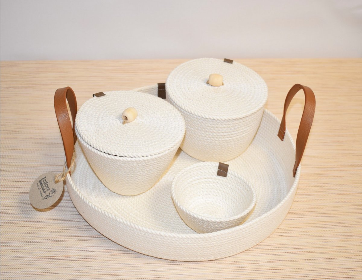 Kulatá ošatka z bavlněných provazů v barvě slonové kosti s košíky a miskou váš jídelní stůl dokonale doladí. Tuto soupravu ale můžete umístit kamkoliv, kde potřebujete ukrýt drobnosti,jako například komoda v předsíni, koupelna a podobně.