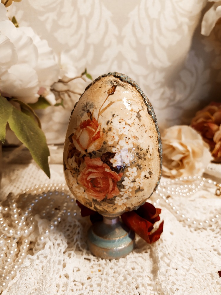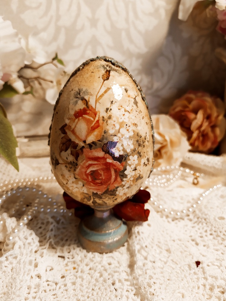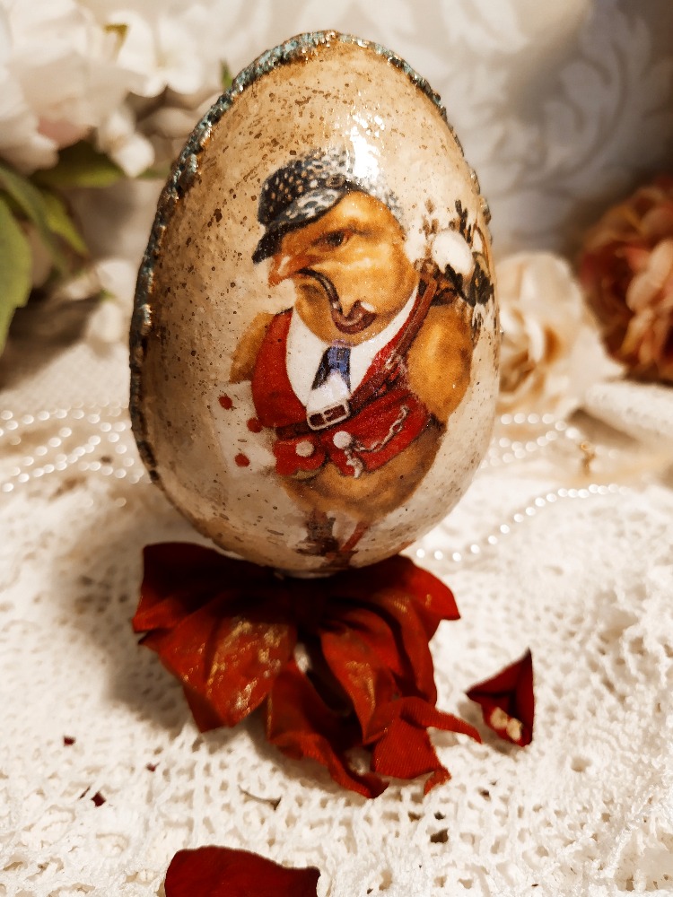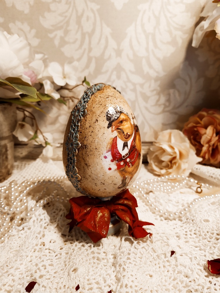 Dekorace vajíčko s motivem kuřátka s uzlíčkem na rameni na vandru. Po obvodu je zdobené květinovou bordurou. Celé vajíčko je patinované zlatavými vosky. Součástí dekorace je dřevěný stojánek, který je ozdobený stuhou ve vintage stylu.