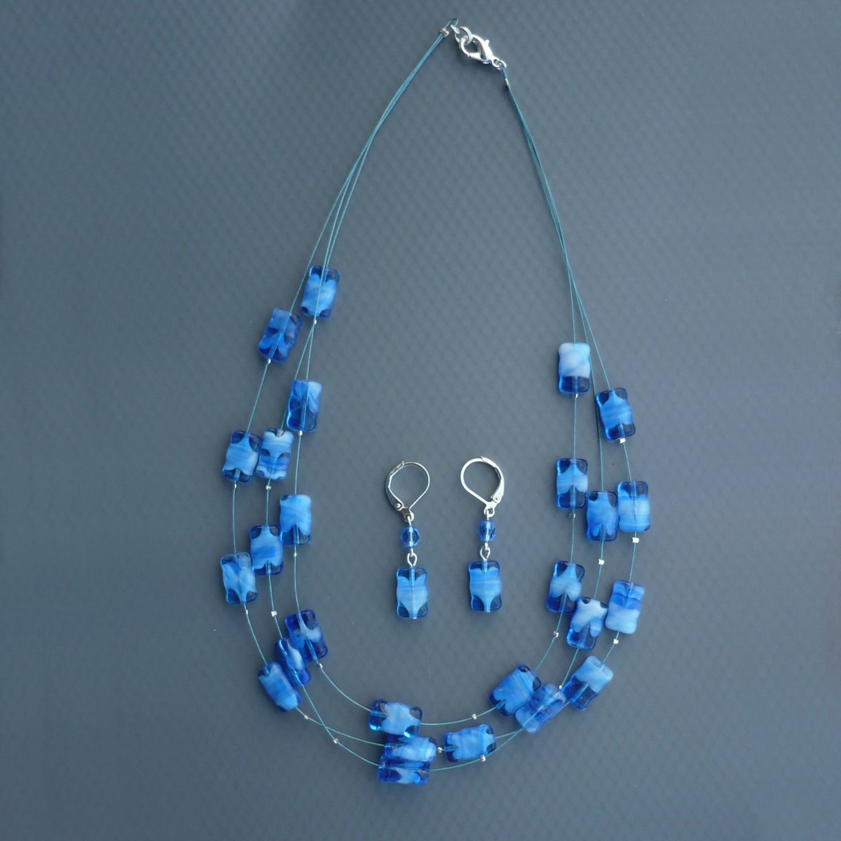 Náhrdelník je tvořený z tří řad pravidelně rozmístěných modrých žíhaných skleněných plochých kvádříků. Všechny korálky jsou navlečeny na bižuterním lanku modré barvy.