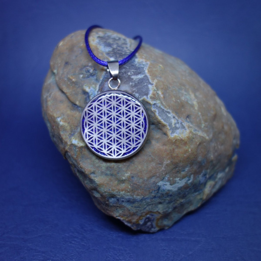 Přívěšek z chirurgické oceli, vnitřní průměr 2,5 cm s motivem květu života stříbrné barvy na třpitivém podkladu tmavé modré barvy. Květ života léčí tělo i duši, harmonizuje, dodává energii, pomáhá napojit se na božskou sílu, vesmírné světlo... Přívěšek je navlečen na voskované bavlněné šňůrce (náhodné barvy), která je povrchově ošetřená voskováním.