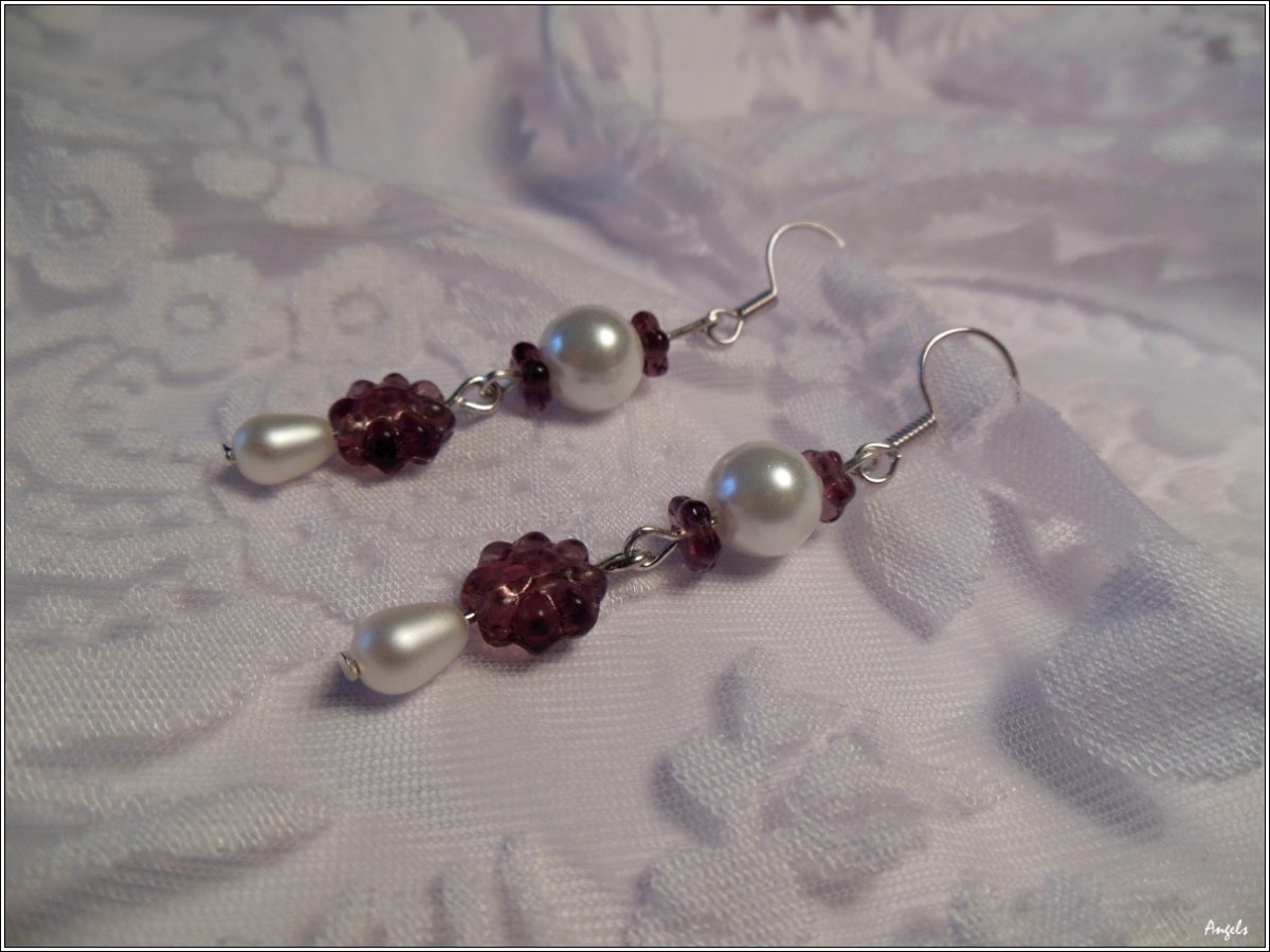 Náušnice ze skleněných korálků v podobě fialových kytiček v kombinaci s voskovými perlemi bílé barvy, se stříbrnými afroháčky z běžného bižuterního kovu. Součástí náušnic jsou i silikonové zarážky. Délka náušnic je 38 mm bez afroháčku.