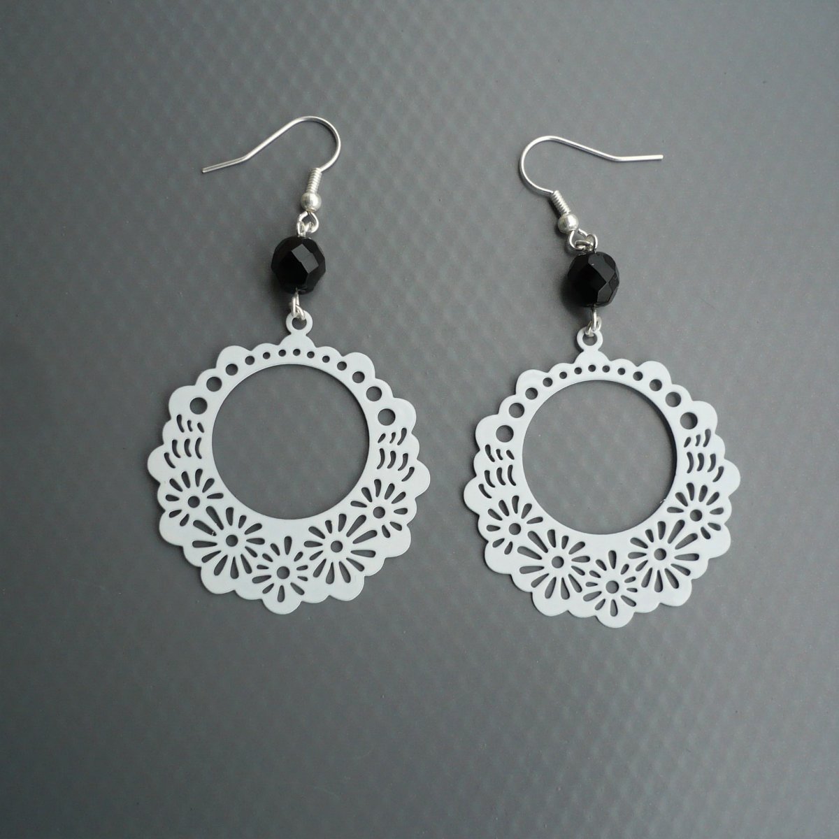 Jednoduché lehoučké náušnice jsou tvořeny horním černým českým broušeným skleněným korálkem a spodním, dekorativně vyřezávaným, velkým bílým plíškem s květinovým motivem.