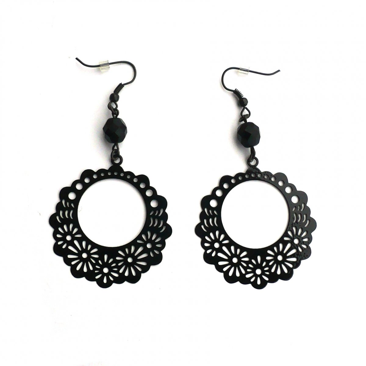 Jednoduché lehoučké náušnice jsou tvořeny horním černým skleněným broušeným korálkem a spodním, dekorativně vyřezávaným, velkým černým plíškem s květinovým motivem.