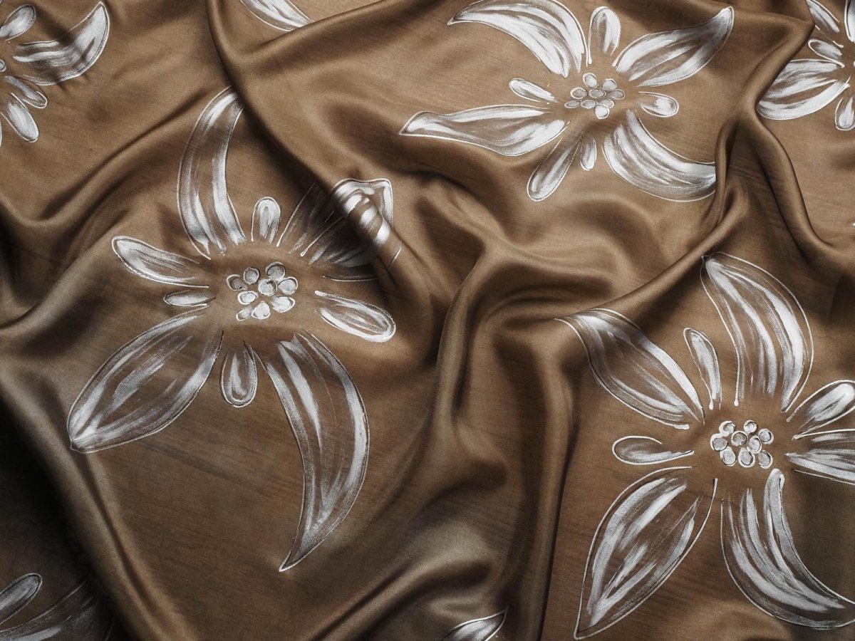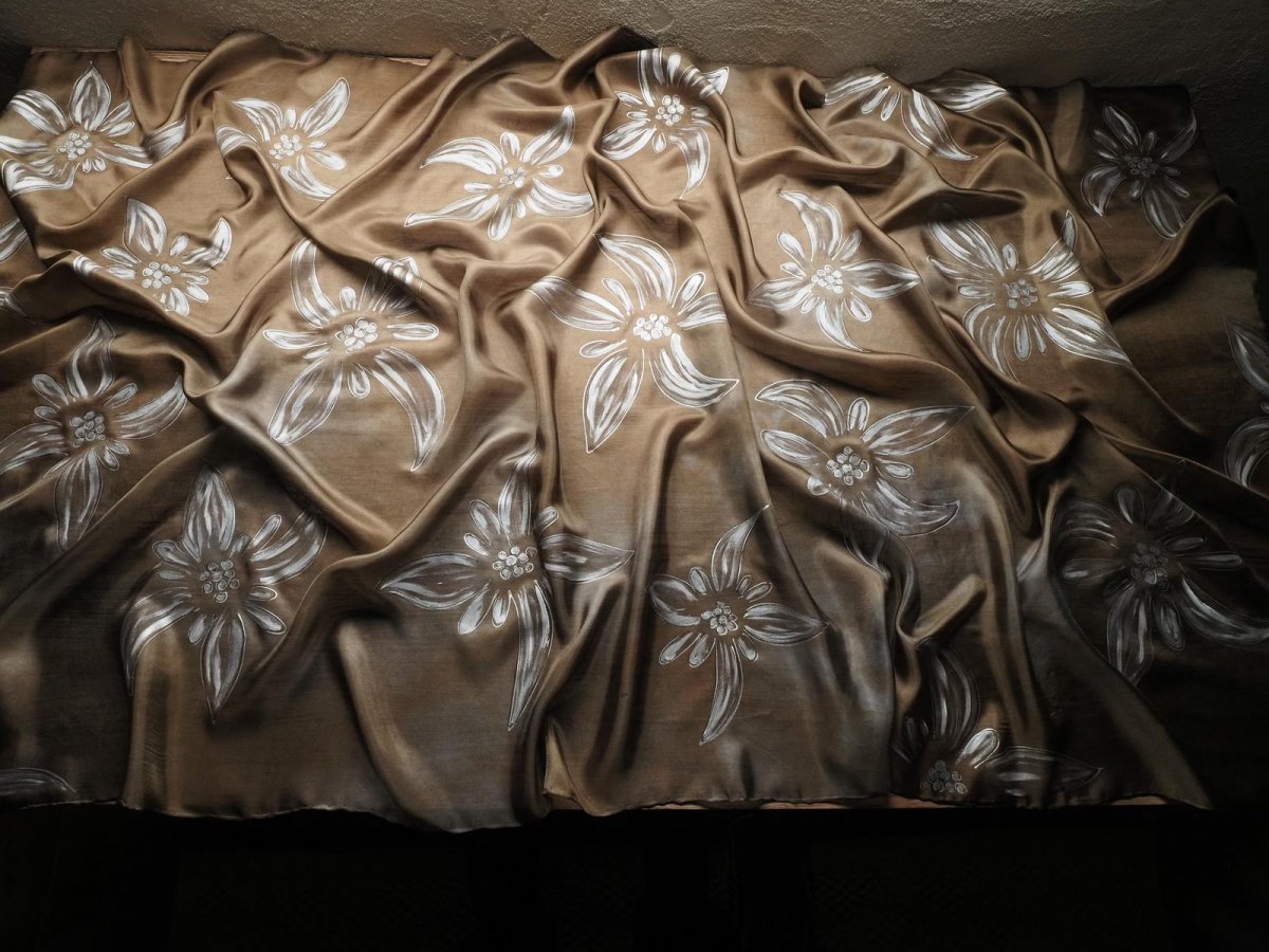 Ručně malovaný šál (pléd) z přírodního hedvábí (pongé 5). Použití kvalitních barev a tepelné fixace zaručuje dlouhodobou odolnost při opakovaném praní. Snadno se žehlí. Květiny jsou namalované na jemně batikovaném podkladu.