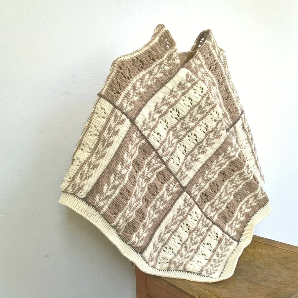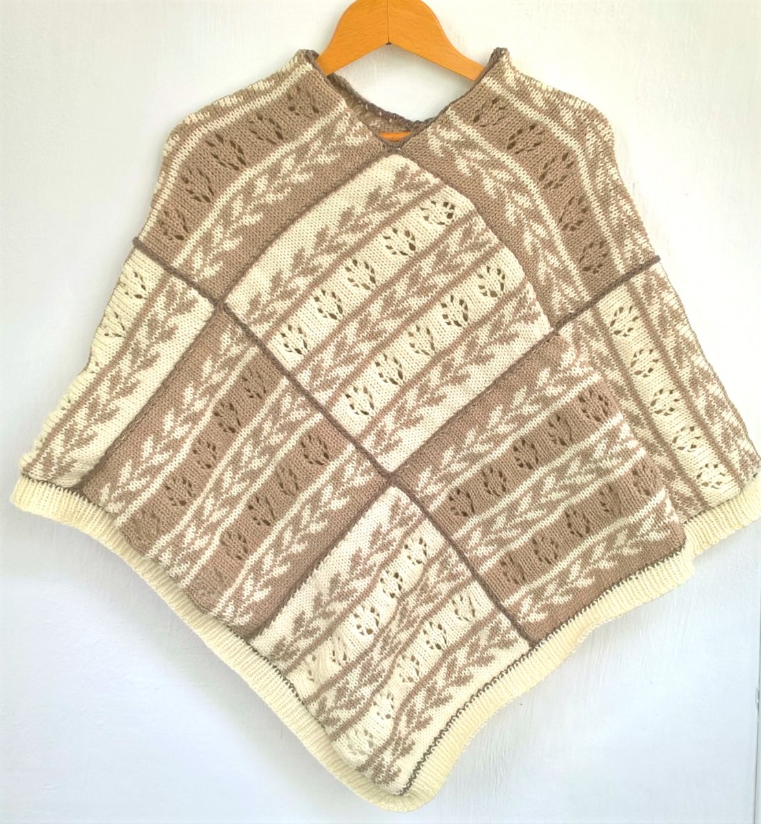 Pončo ze vzorovaných čtverců je upletené podle vlastního návrhu. Čtverce jsou dohromady sháčkovány, okraje ponča mají pružné lemy, okolo výstřihu je okraj obháčkován. Zadní strana je řešená stejně jako přední.