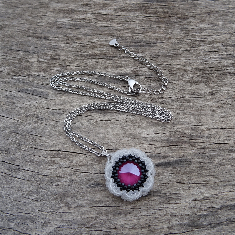 Ručně šitý přívěsek z rivoli od firmy Swarovski čiré, zadní strana je růžové, kterou jsem obšila japonským Toho rokajlem v barvě: černé, tmavě šedé s matným povrchem, transparentní bílé s matným povrchem.