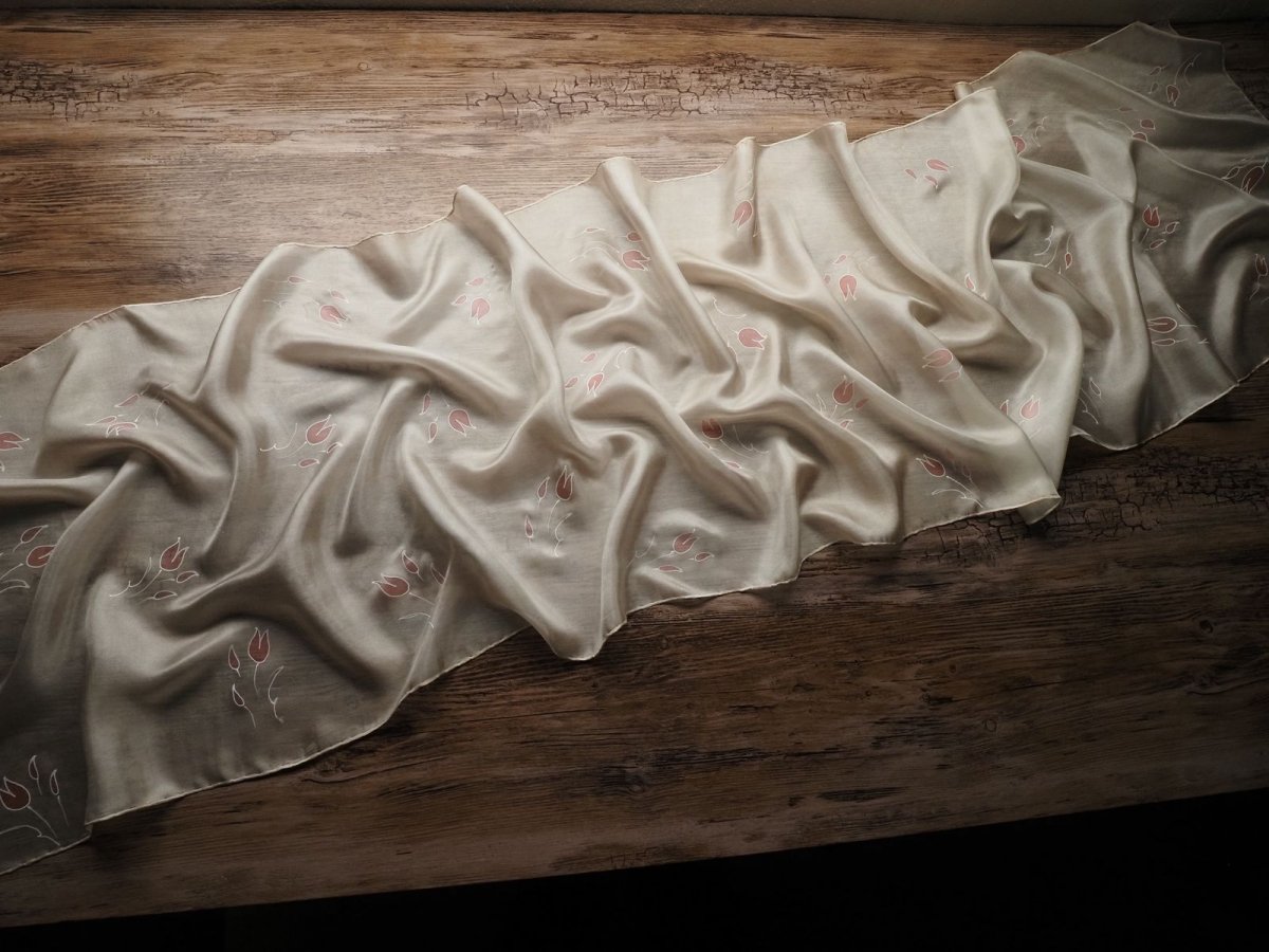 Ručně malovaný šál z přírodního hedvábí (pongé 5). Použití kvalitních barev a tepelné fixace zaručuje dlouhodobou odolnost při opakovaném praní. Snadno se žehlí.