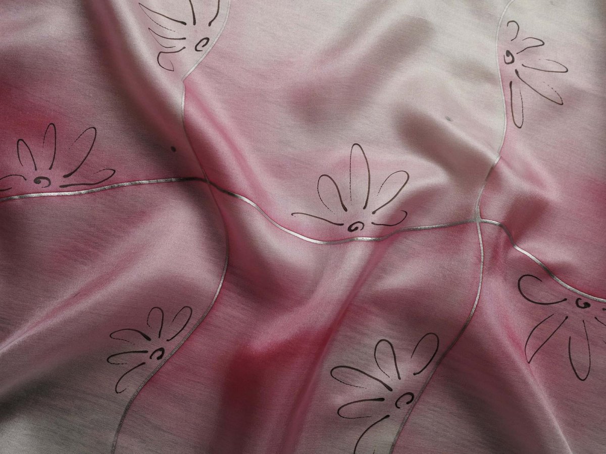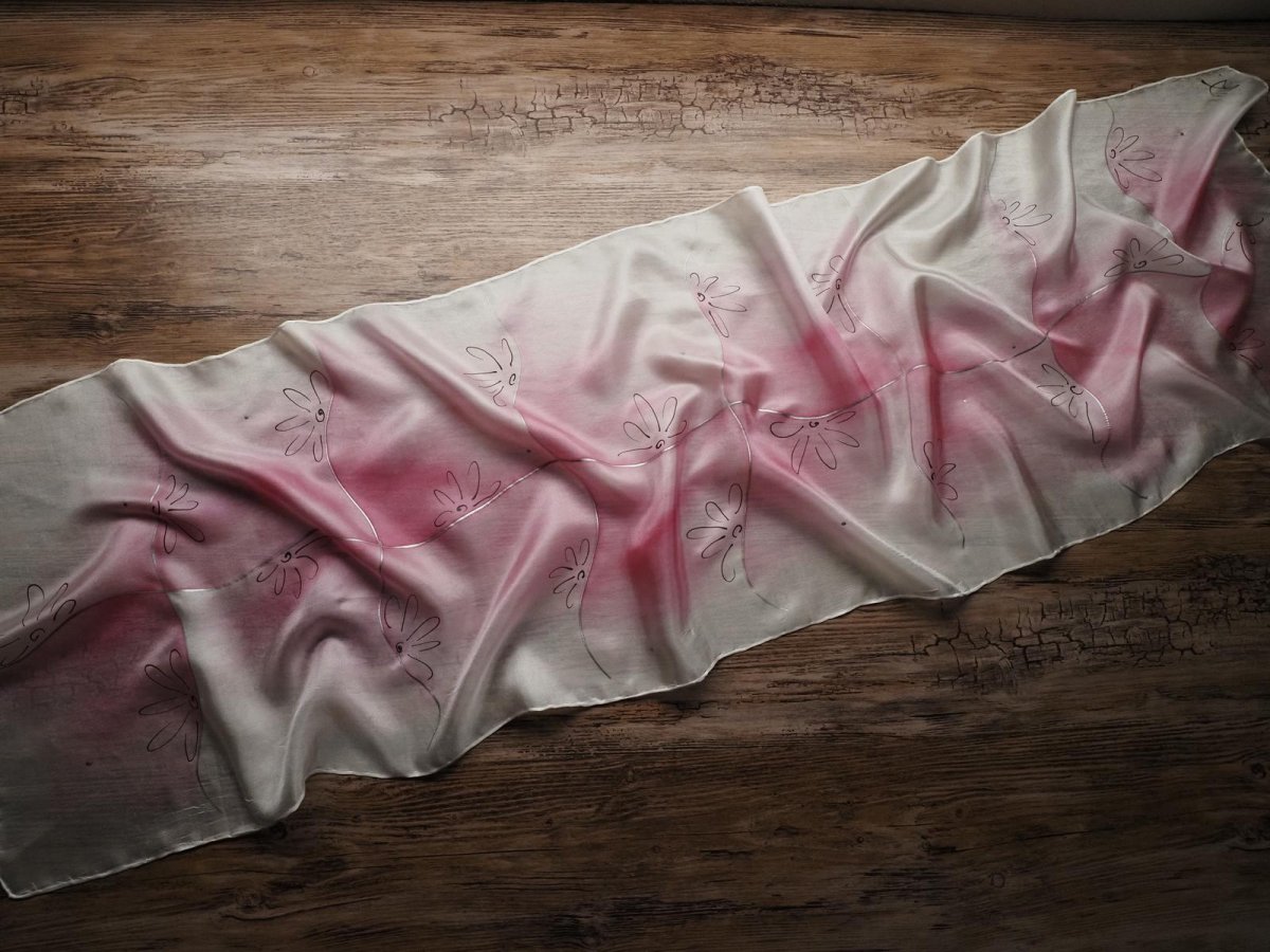 Ručně malovaný šál z přírodního hedvábí (pongé 5). Použití kvalitních barev a tepelné fixace zaručuje dlouhodobou odolnost při opakovaném praní. Snadno se žehlí.