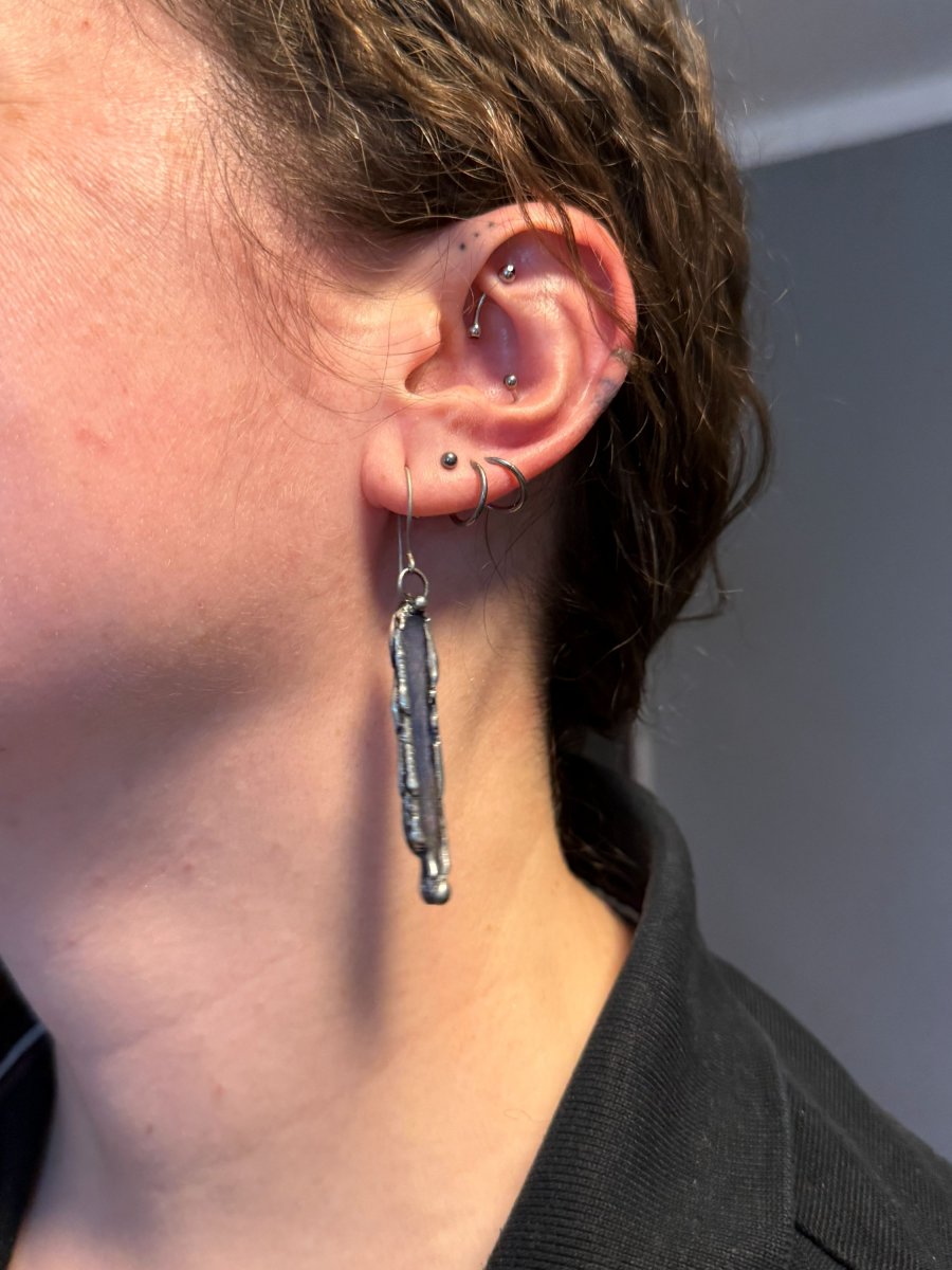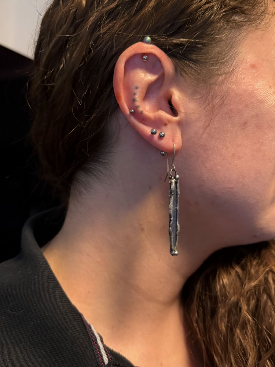 Použitý materiál: bezolovnatý cín. Černá patina obroušena do starostříbrné barvy. Vše ošetřeno antioxidačním olejem a vyleštěno karnaubským voskem.