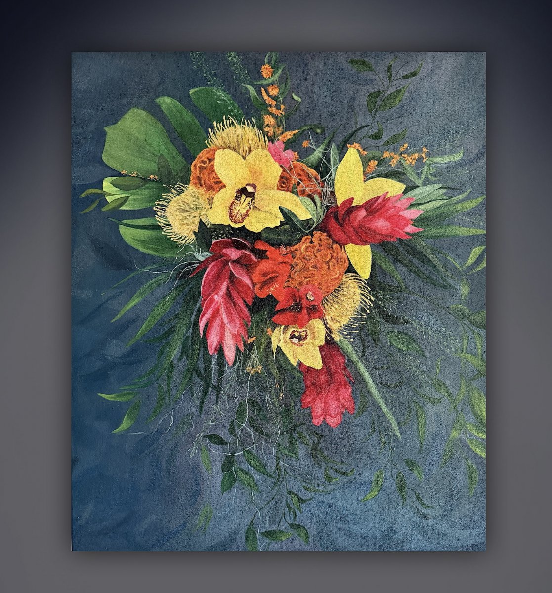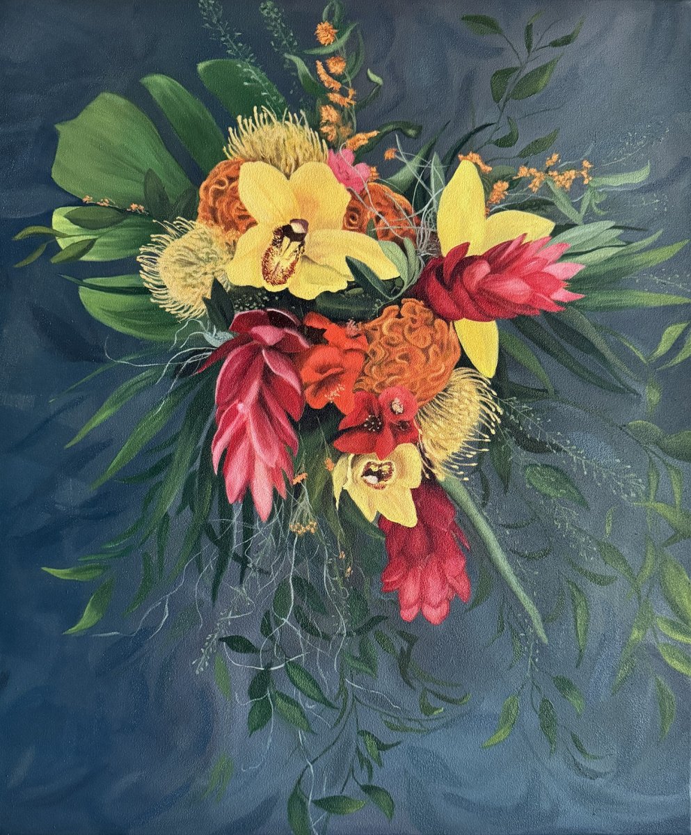 olejomalba na plátně zachycuje bohatou tropickou kytici složenou z exotických květin. Kompozice je dynamická a plná kontrastů - syté barvy květin vystupují z hlubokého, modrého pozadí a jsou obklopeny zelení a jemnými větvičkami.