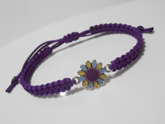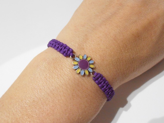 Náramek je vyroben z fialové šňůrky a kovového smaltovaného mezidílu - Kytička.