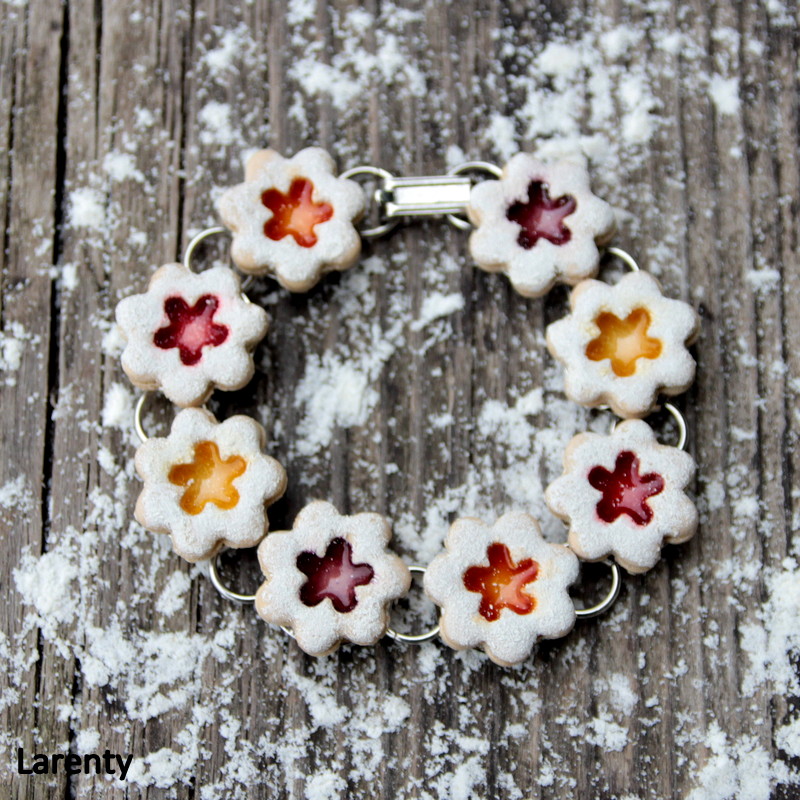 Cukroví je přilepeno na velice kvalitní kovové konstrukci náramku, která je velice pevná a zdobení z FIMA nijak nenamáha, jeho celková délka je cca 20 cm.