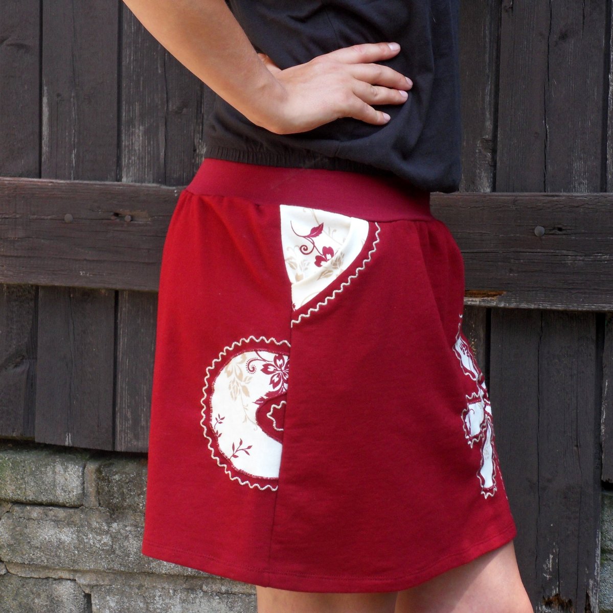 Velikost: náplet v nenataženém stavu 2x 32 cm, natáhne se až na 2x 44 cm, boky až do obvodu 100 cm, celková délka sukně je 43 cm.